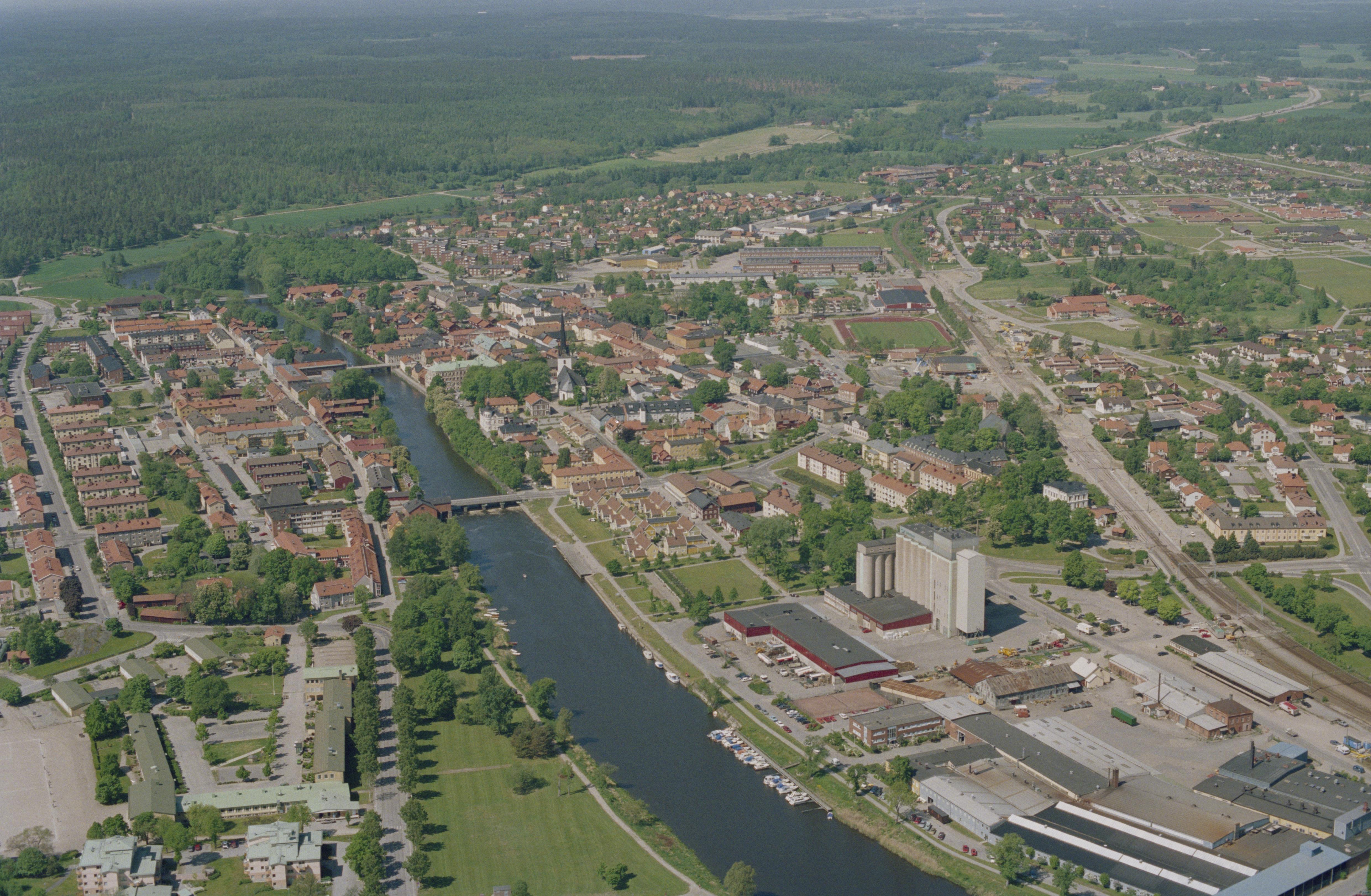 Beskrivning: Arboga stad vid Arbogaån. Stadslager RAÄnr Arboga stad 34:1. Sankt Nikolai kyrka vid bildens mitt. Heliga Trefaldighetskyrka till vänster över bildens mitt. Bilden är tagen mot (väderstreck): V