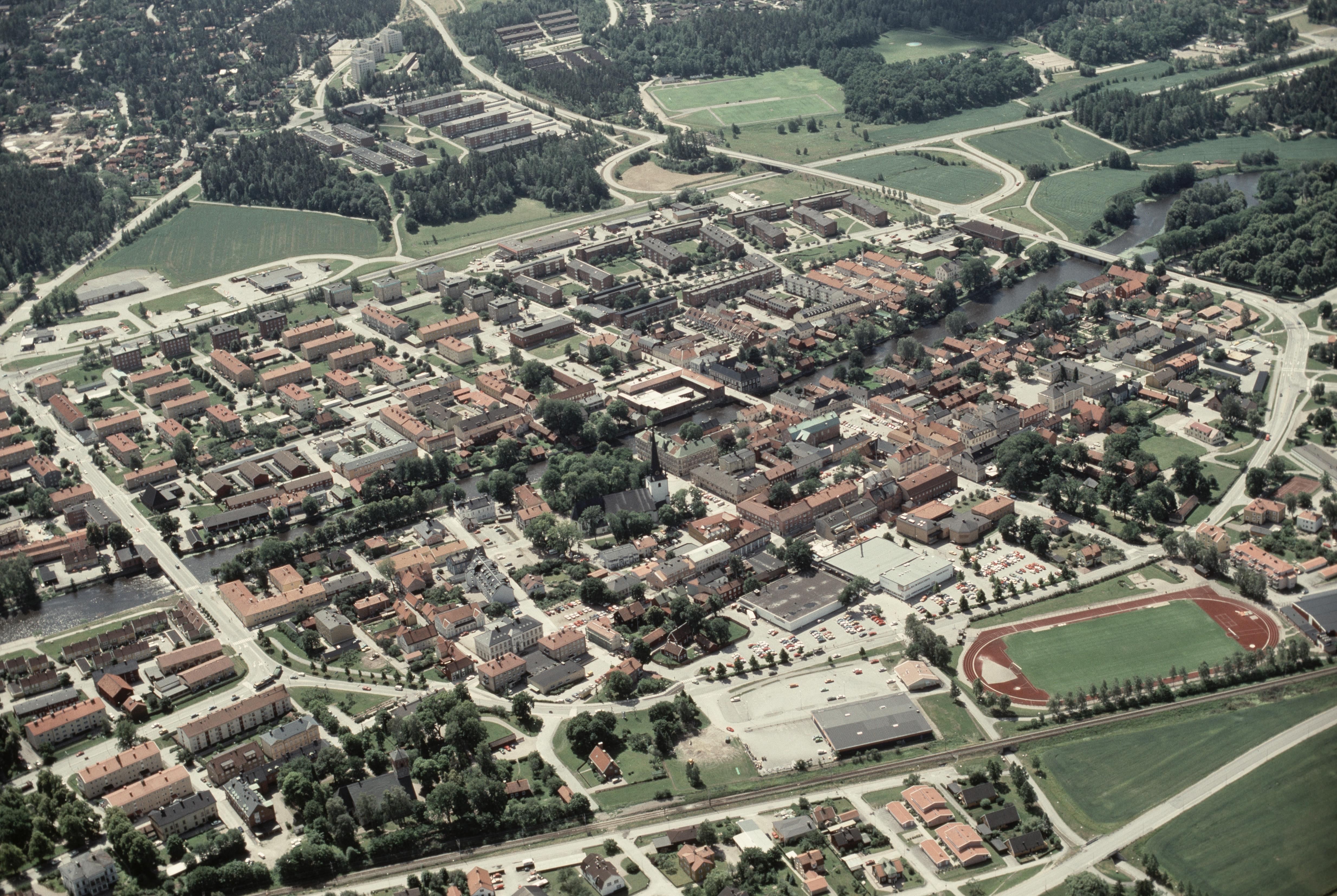 Beskrivning: Arboga stad vid Arbogaån. Stadslager RAÄnr Arboga stad 34:1. Nere till vänster Sankt Nikolai kyrka. Heliga Trefaldighetskyrka vid bildens mitt. Bilden är tagen mot (väderstreck): SV