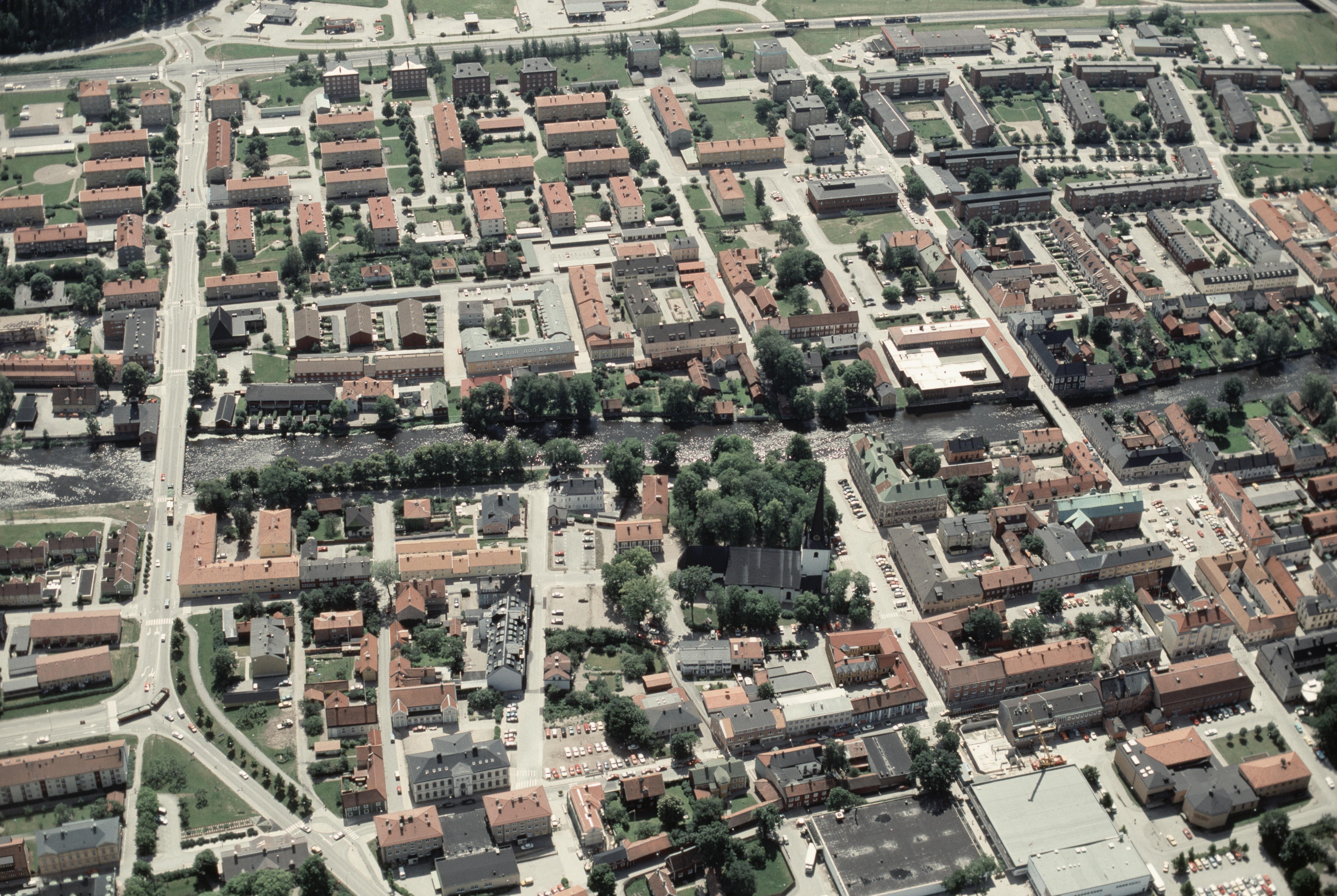 Beskrivning: Arboga stad vid Arbogaån. Heliga Trefaldighetskyrka i stadslager RAÄnr Arboga stad 34:1 under bildens mitt. Bilden är tagen mot (väderstreck): S