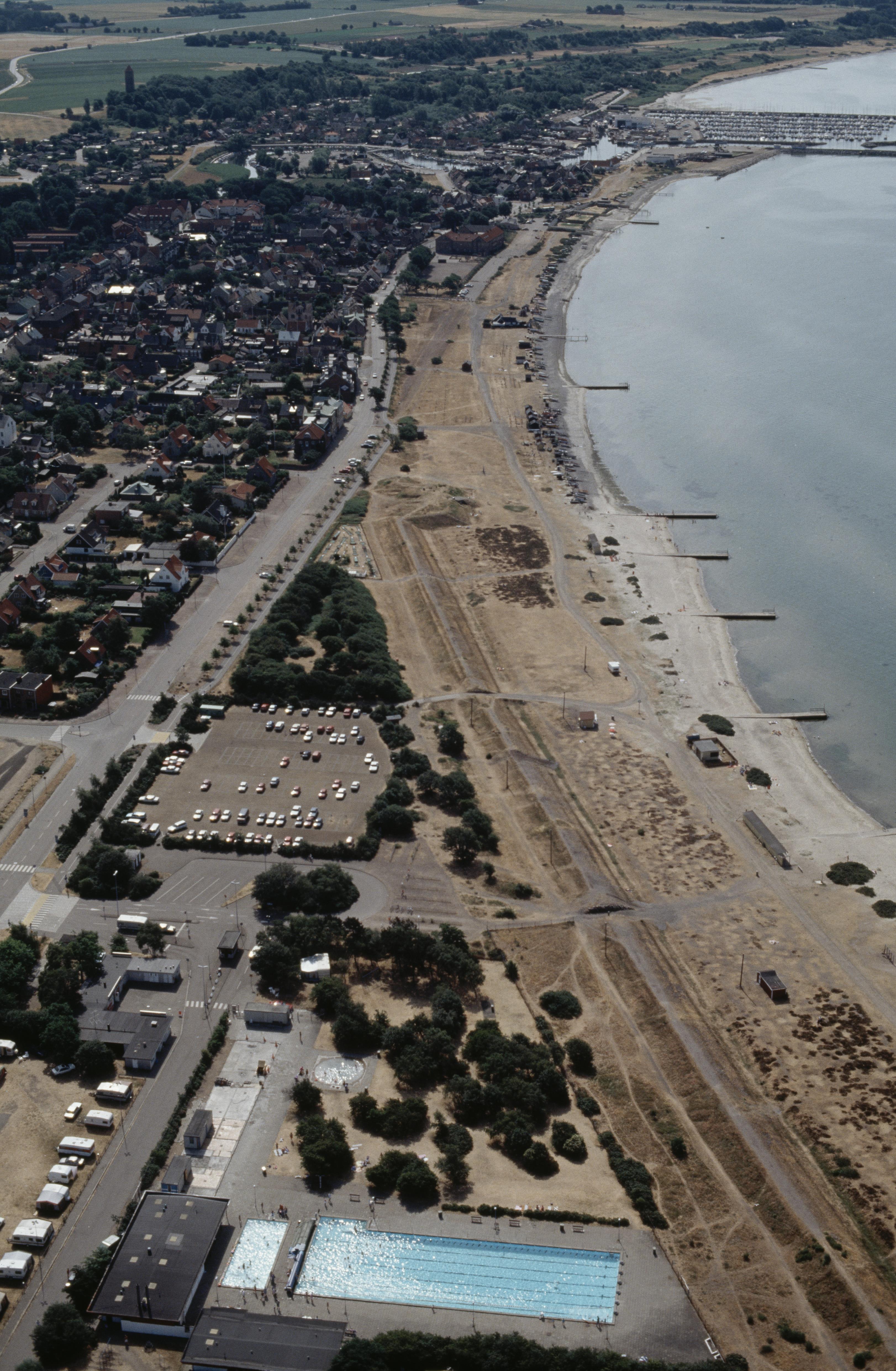 Beskrivning: (Tidigare Raus socken). Campingplats, badplats. Råå vallar RAÄnr Helsingborg 92:1 vid stranden. I bildens övre del Råå-åns utflöde i Öresund. Bilden är tagen mot (väderstreck): S