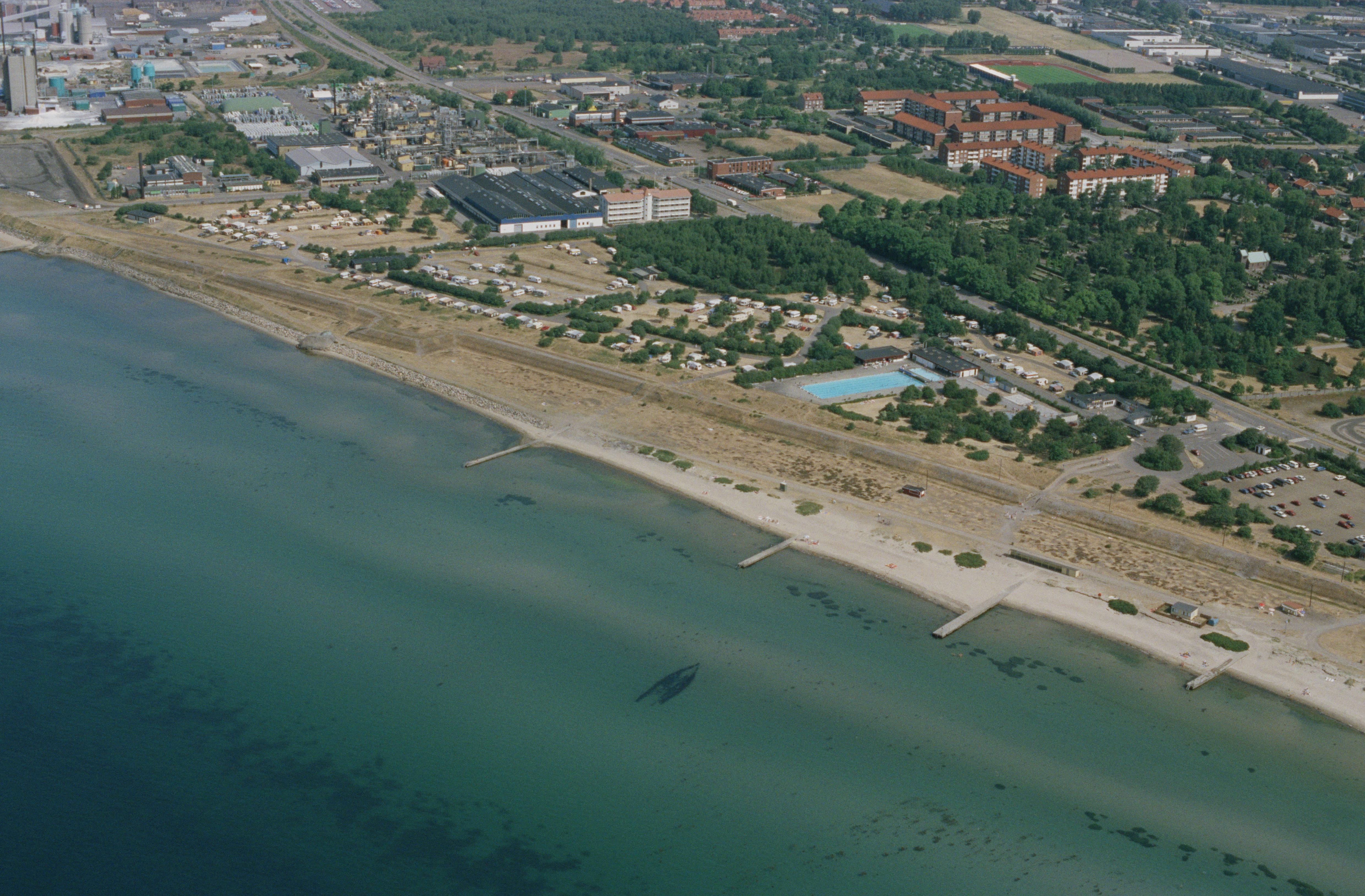 Beskrivning: (Tidigare Raus socken). Campingplats, badplats. Råå vallar RAÄnr Helsingborg 92:1 vid stranden. Ett skeppsvrak i vattnet vid bildens mitt. Bilden är tagen mot (väderstreck): NO