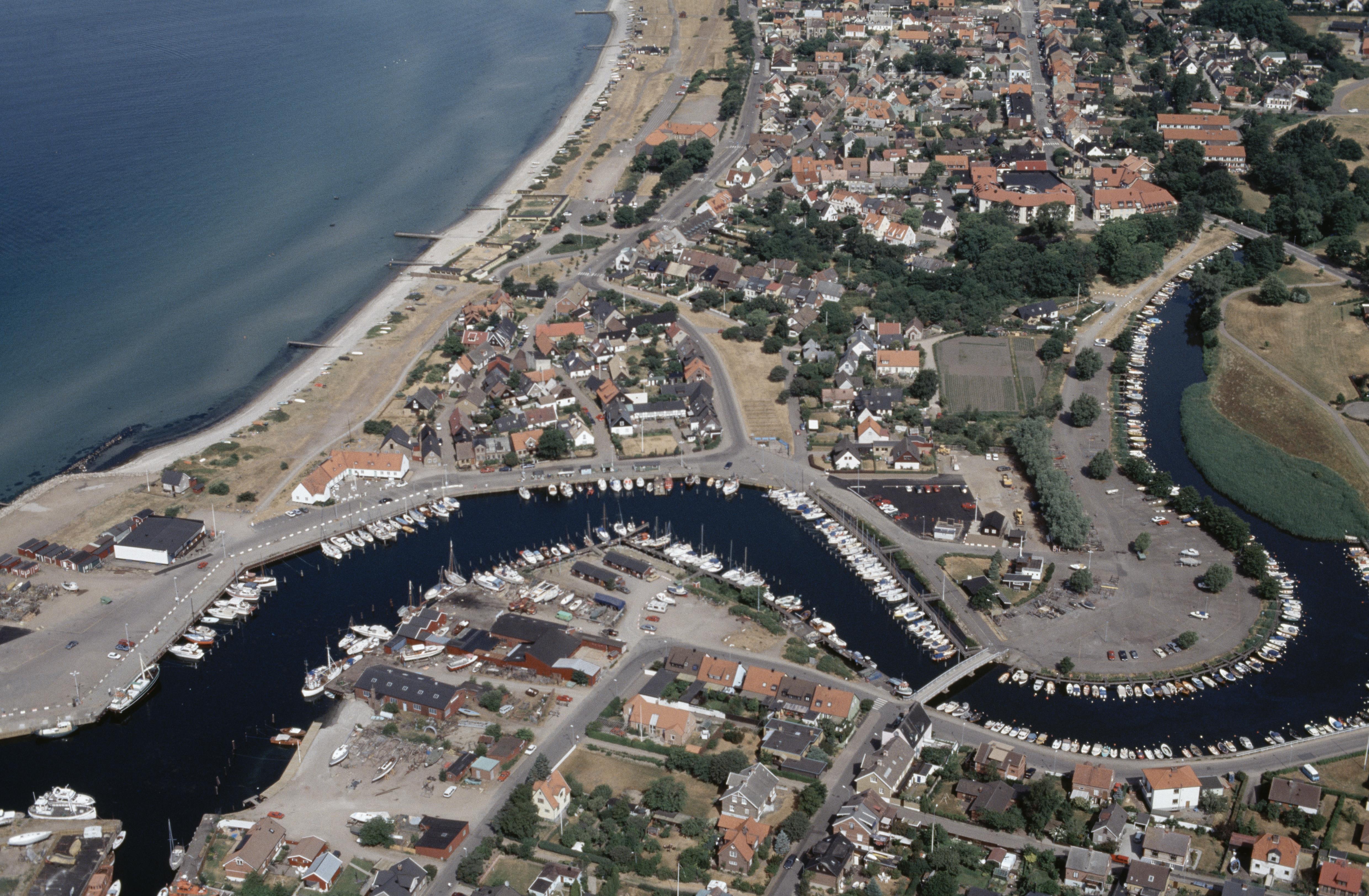 Beskrivning: (Tidigare Raus socken). Råå hamn med Råå-åns utflöde i Öresund. Bilden är tagen mot (väderstreck): NV