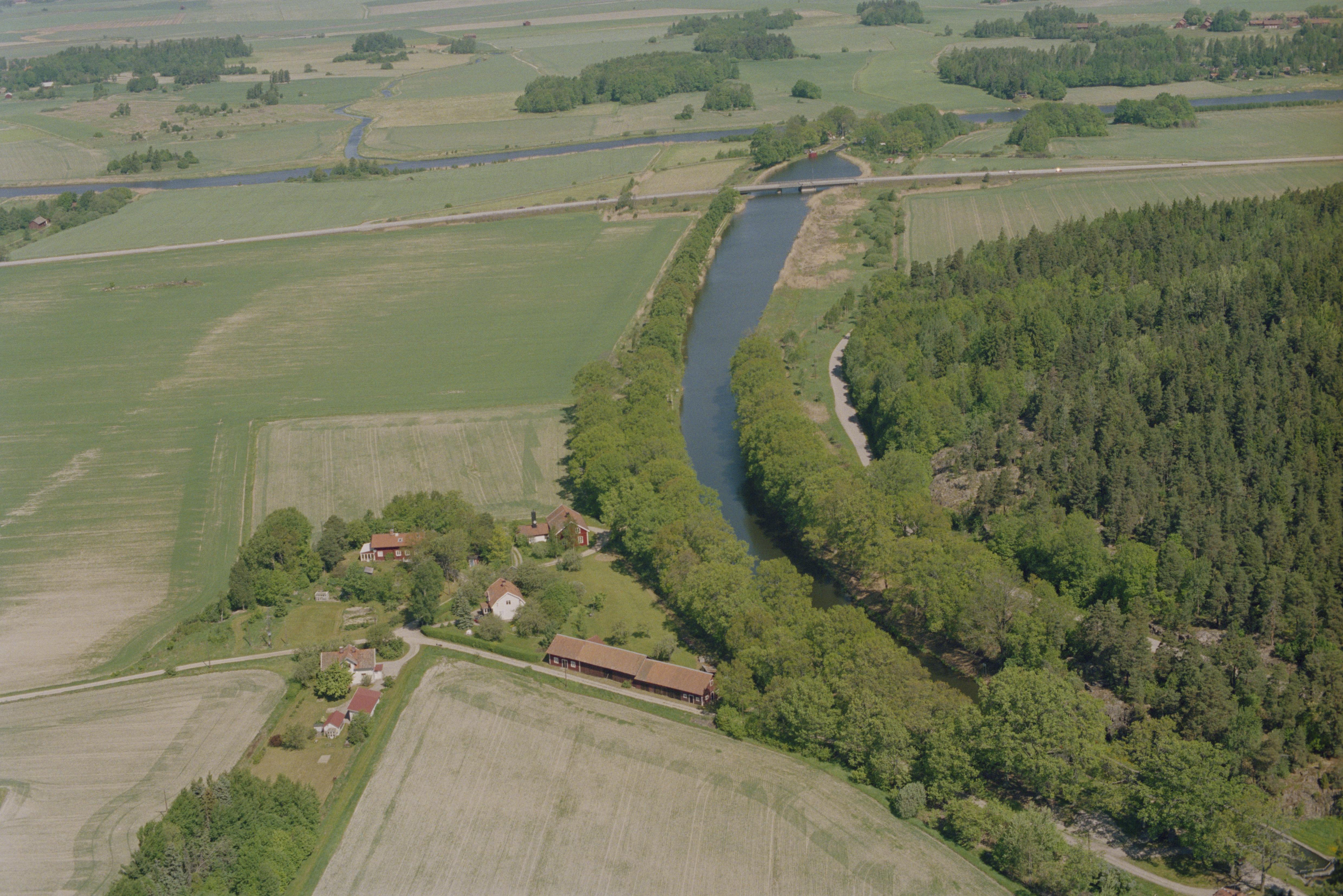 Beskrivning: Säbyberget till höger. Vid bildens mitt möts Hjälmare nya och gamla kanal (skymtas uppe till vänster), Lillån och Arbogaån i området Näsby Gravudden. Arbogaån markerar gränsen mot Arboga socken (i bildens övre del). I bildens övre del stensättning RAÄnr Säterbo 13:1 vid Lilliåns mynning. Bilden är tagen mot (väderstreck): N
