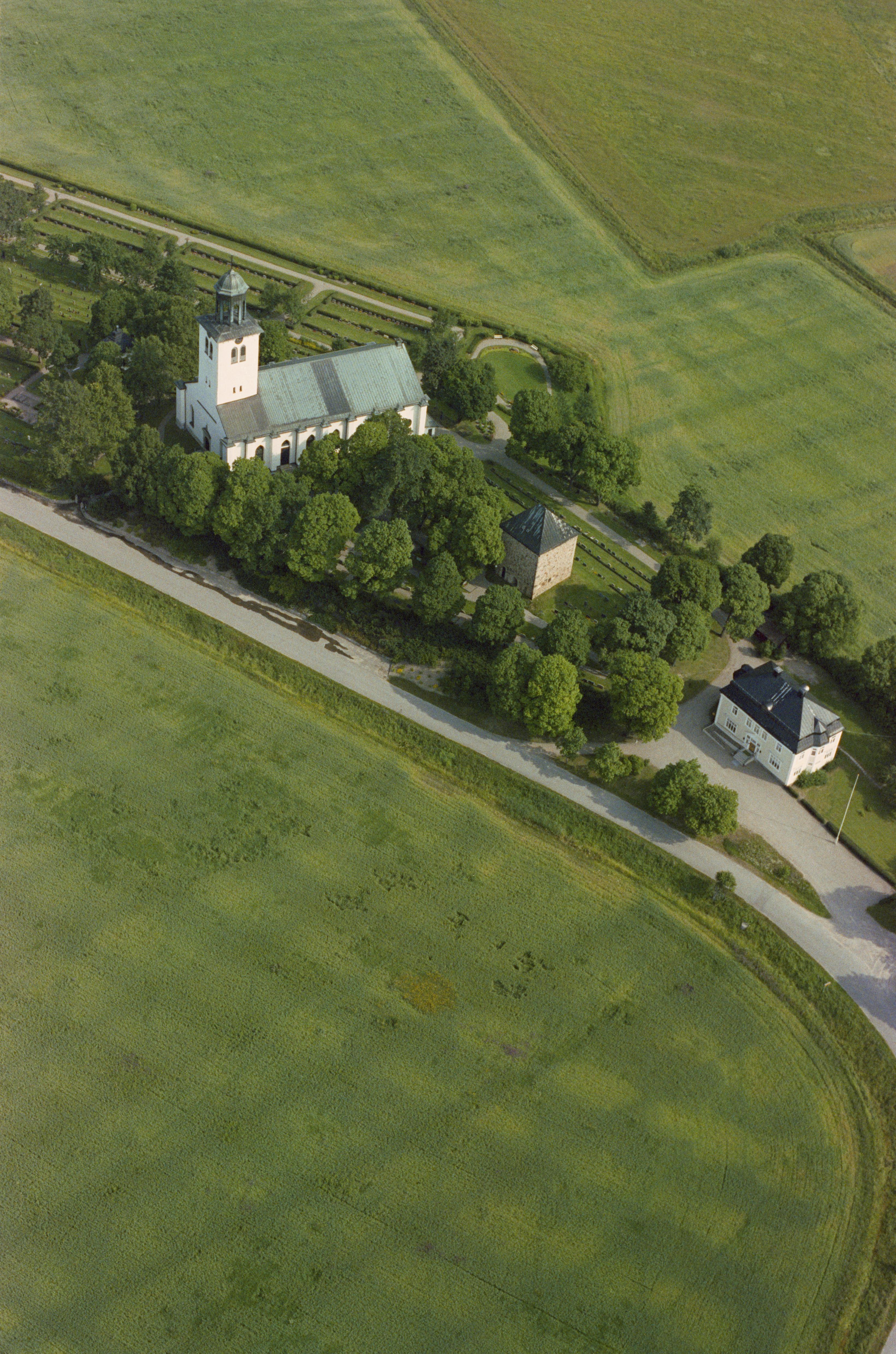 Beskrivning: Fellingsbro kyrka och kyrkby i Ässingåns dalgång. Till höger om bildens mitt kastalruinen RAÄnr Fellingsbro 231:1. Bilden är tagen mot (väderstreck): N