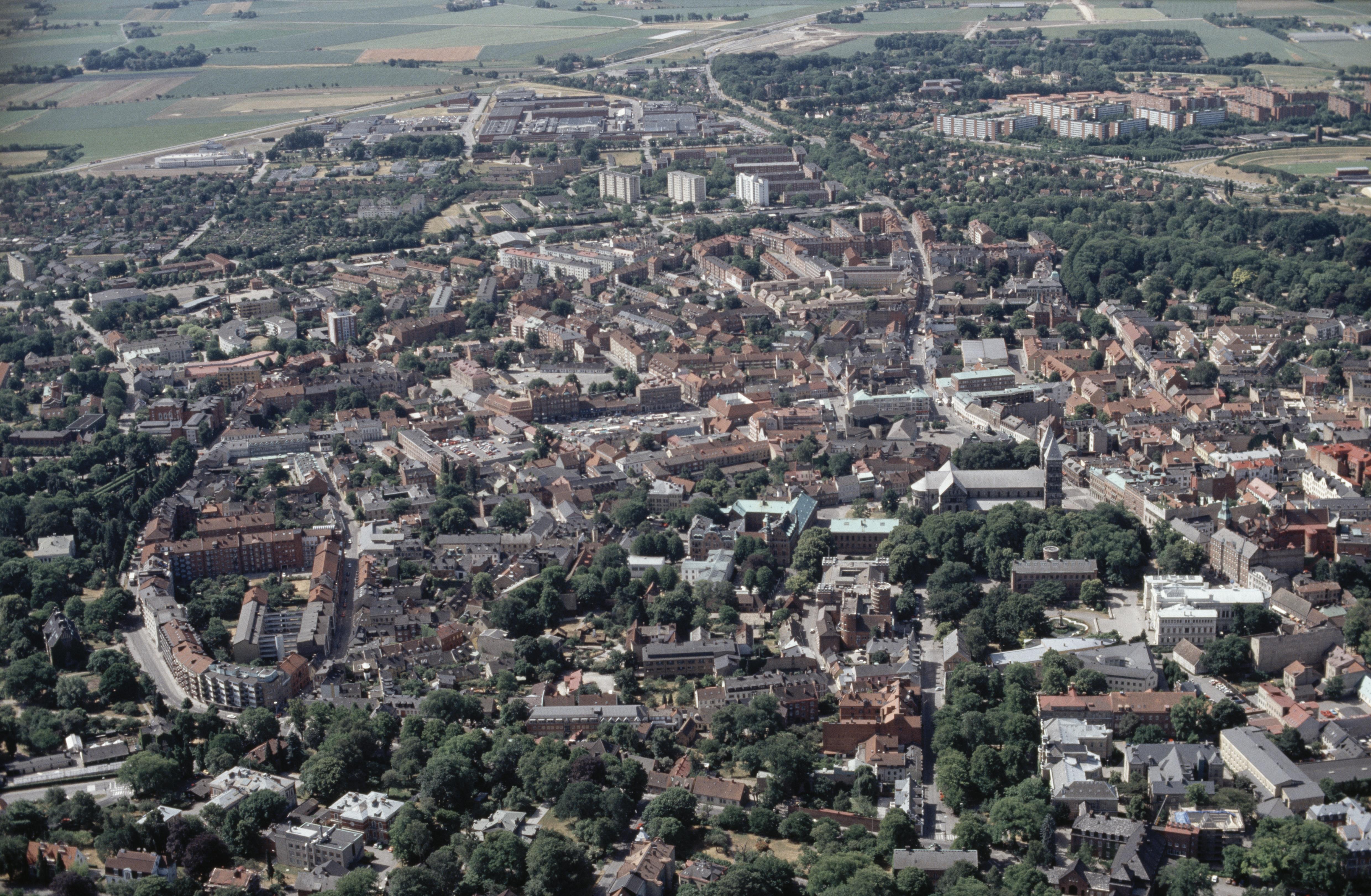 Beskrivning: Lunds stad. Lunds domkyrka till höger om bildens mitt. Bilden är tagen mot (väderstreck): SV
