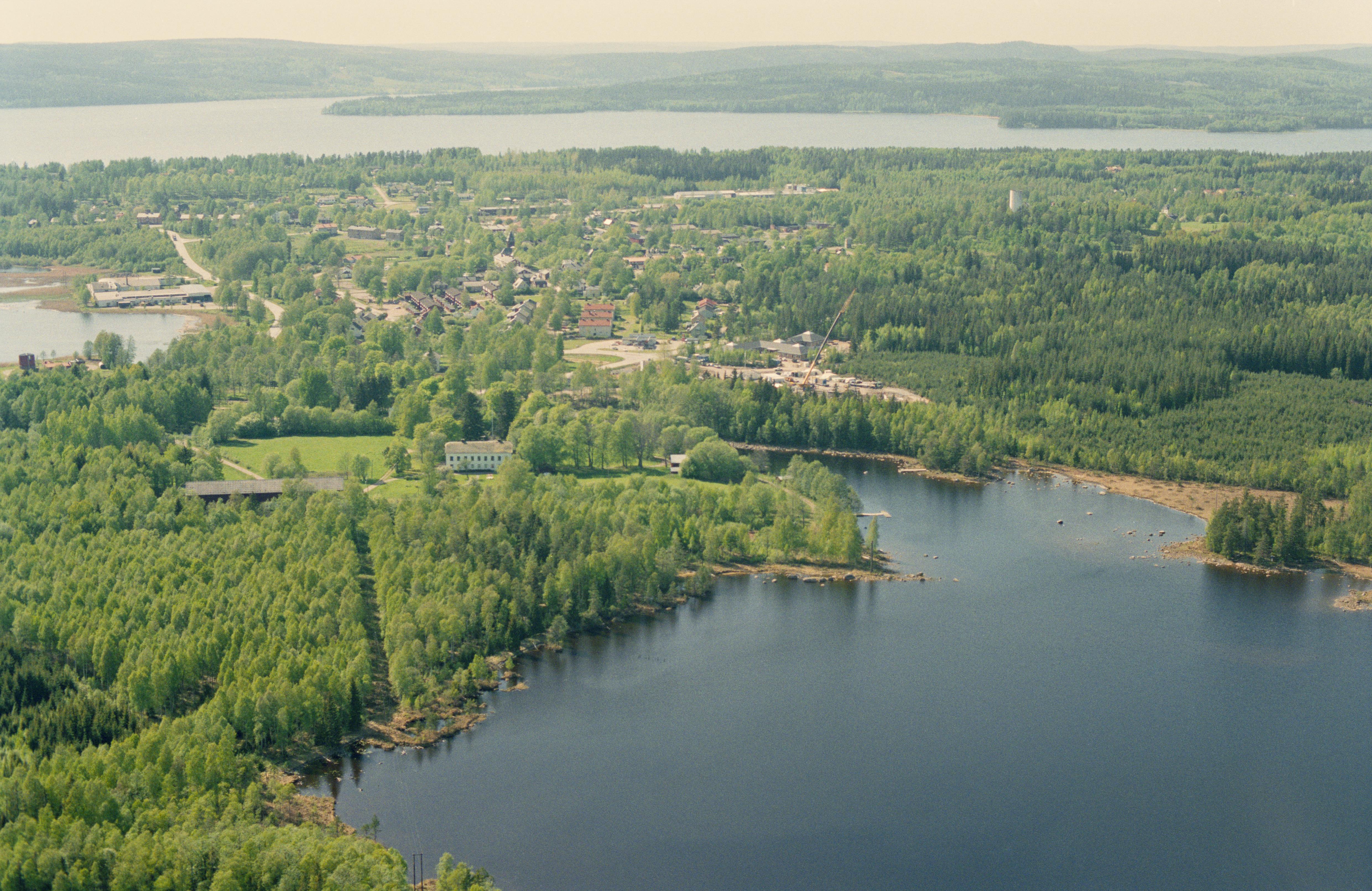 Beskrivning: Tätorten Grythyttan. Till vänster under bildens mitt Grythytte herrgård vid Grythyttans gamla tomt RAÄnr Grythyttan 45:1-2 vid sjön Stor-Älgen. Sjön Torvarpen i bildens övre del. Bilden är tagen mot (väderstreck): V