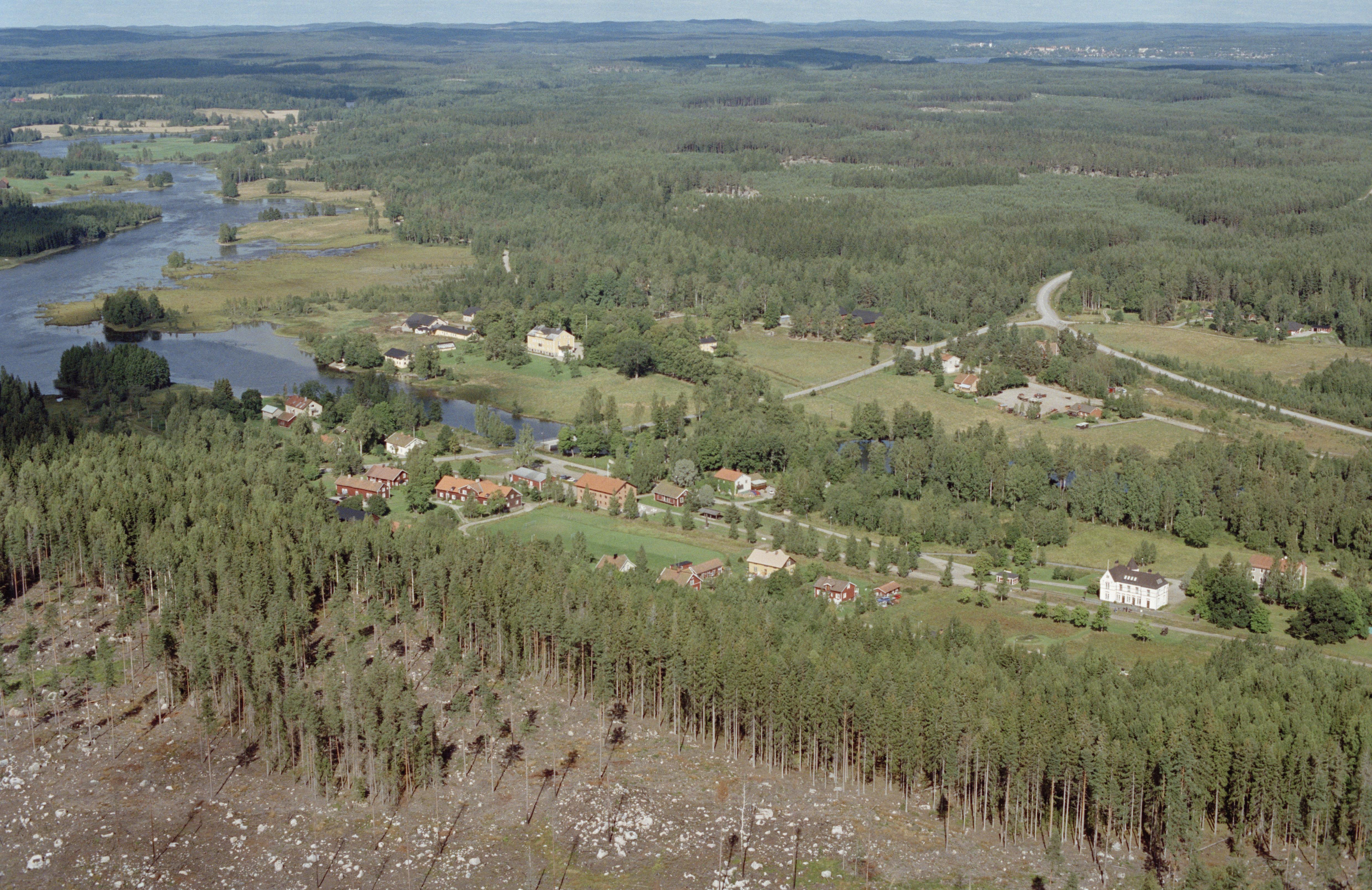 Beskrivning: Uttersbergs bruk i Hedströmmens dalgång. Hedströmmen markerar gränsen mellan socknen Hed (till vänster) och Skinnskatteberg (till höger). Vid bildens mitt hytt- och hammarområde RAÄnr Hed 15:1 och Skinnskatteberg 10:1. Bilden är tagen mot (väderstreck): N