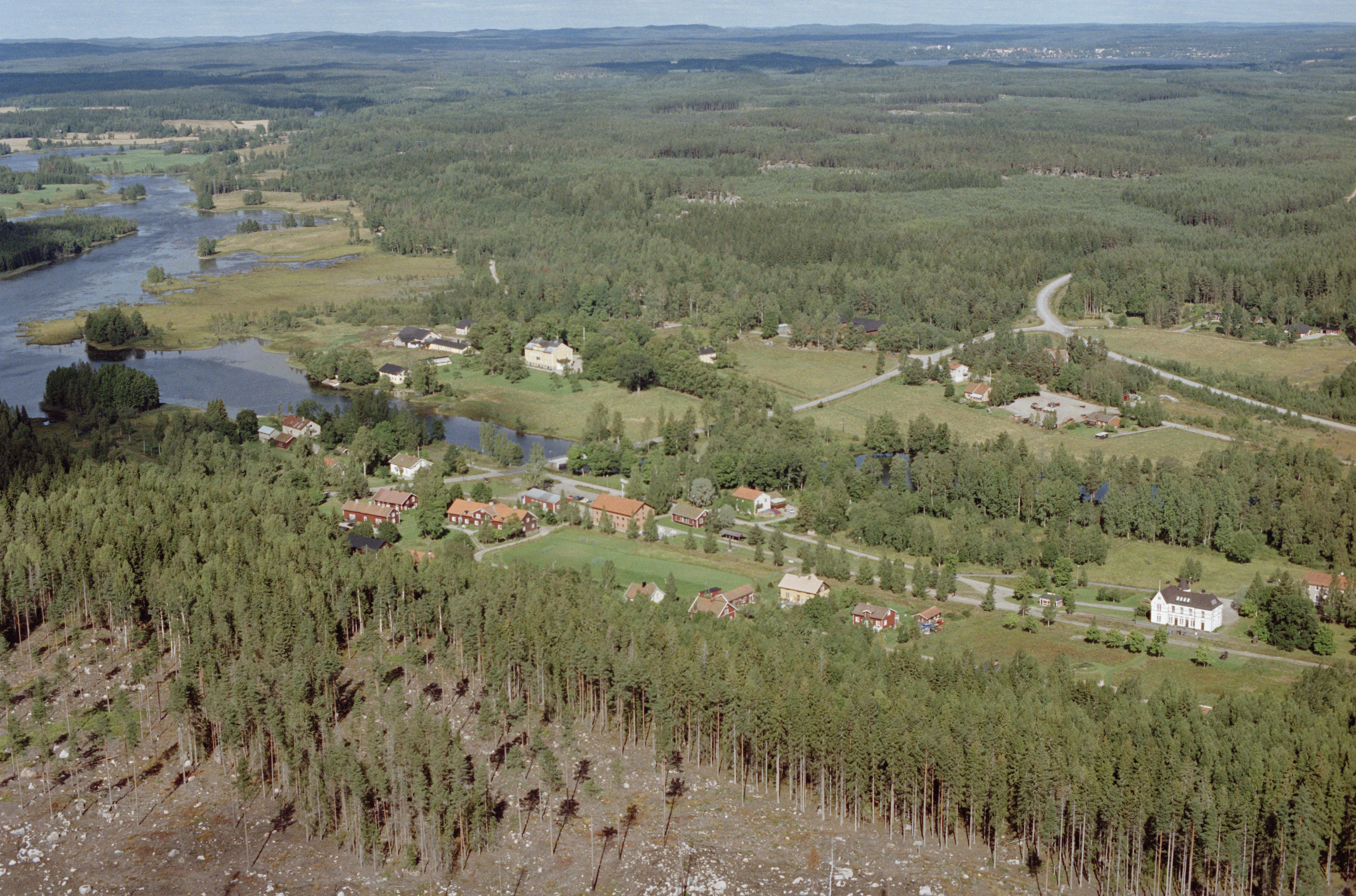 Beskrivning: Uttersbergs bruk i Hedströmmens dalgång. Hedströmmen markerar gränsen mellan socknen Hed (till vänster) och Skinnskatteberg (till höger). Vid bildens mitt hytt- och hammarområde RAÄnr Hed 15:1 och Skinnskatteberg 10:1. Bilden är tagen mot (väderstreck): N