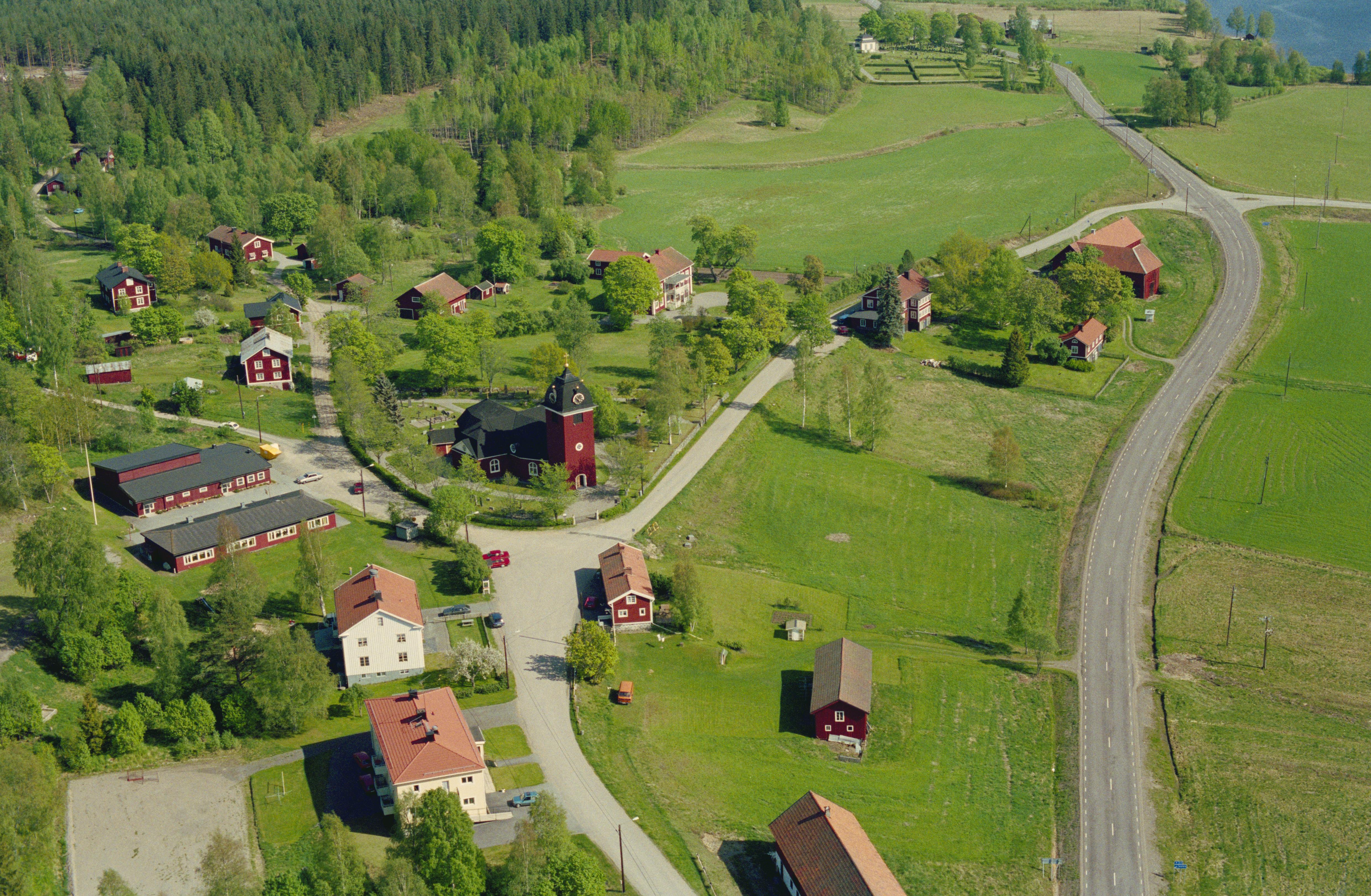Beskrivning: Hjulsjö kyrkby. Hjulsjö kyrka vid bildens mitt. Hjulsjön uppe till höger. Bilden är tagen mot (väderstreck): SO