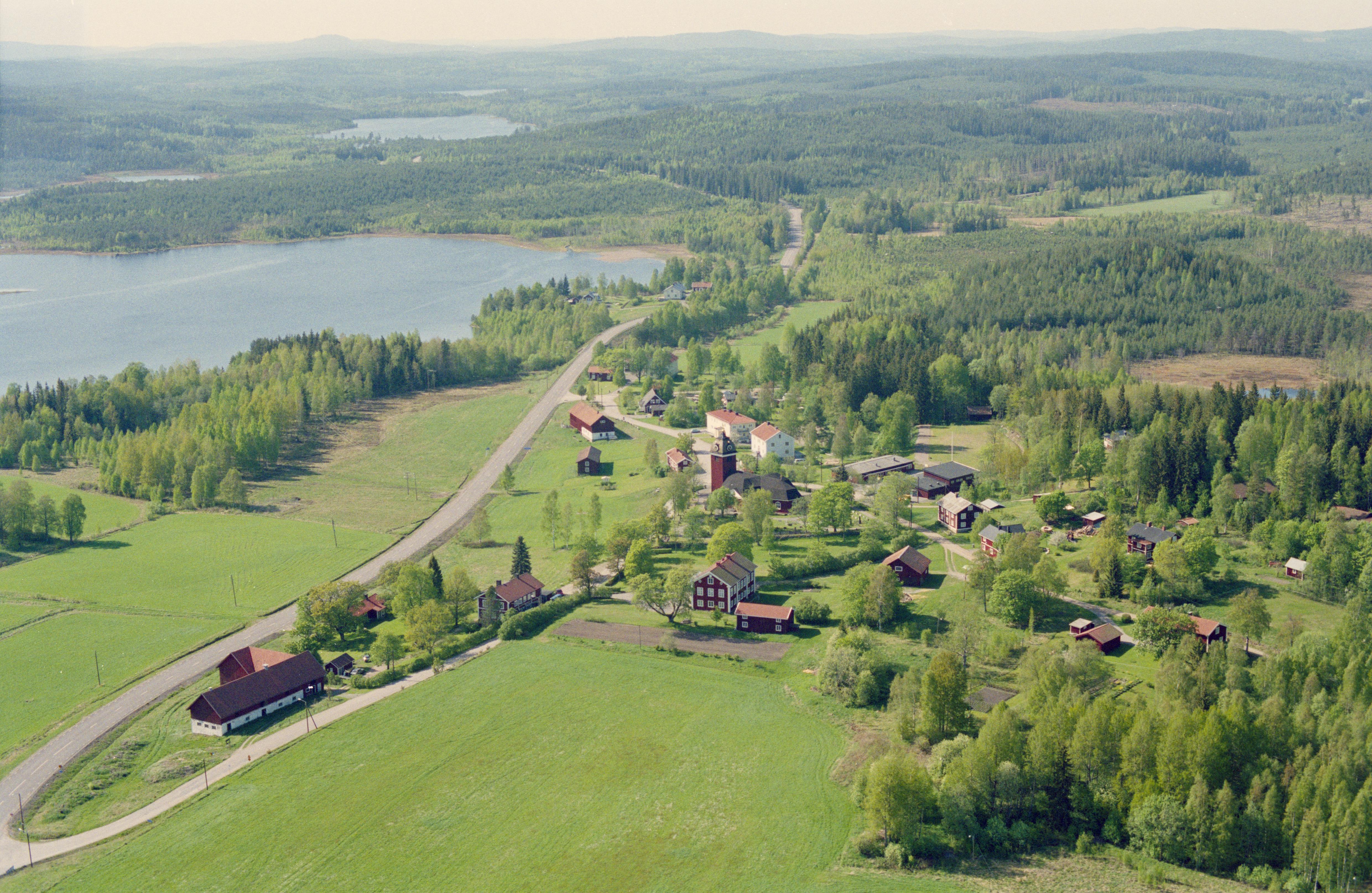 Beskrivning: Hjulsjö kyrkby. Hjulsjö kyrka vid bildens mitt. Sjön Kvisseln uppe till vänster. Bilden är tagen mot (väderstreck): VNV