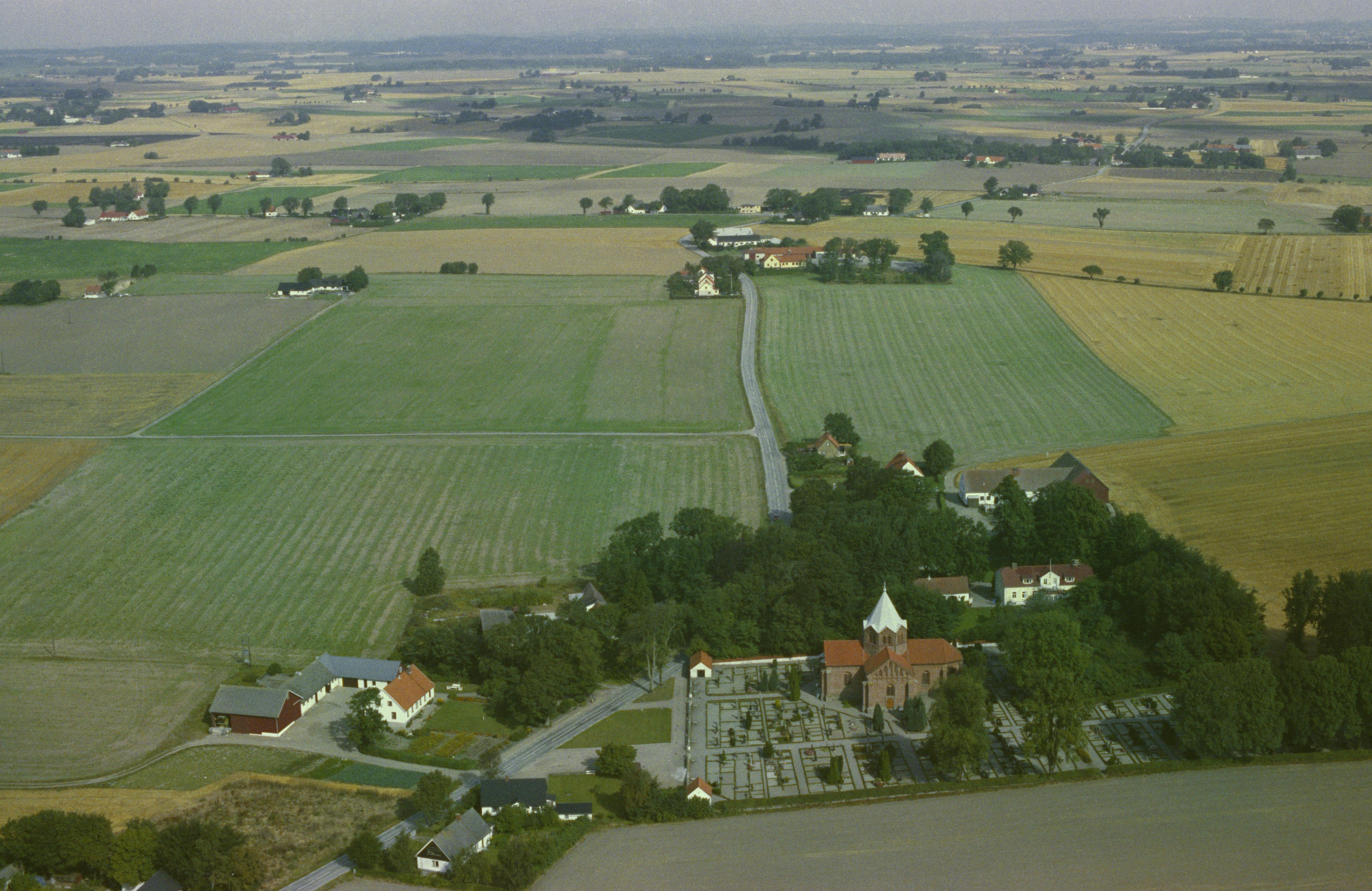 Beskrivning: Tullstorps kyrka och kyrkby. Bilden är tagen mot (väderstreck): N