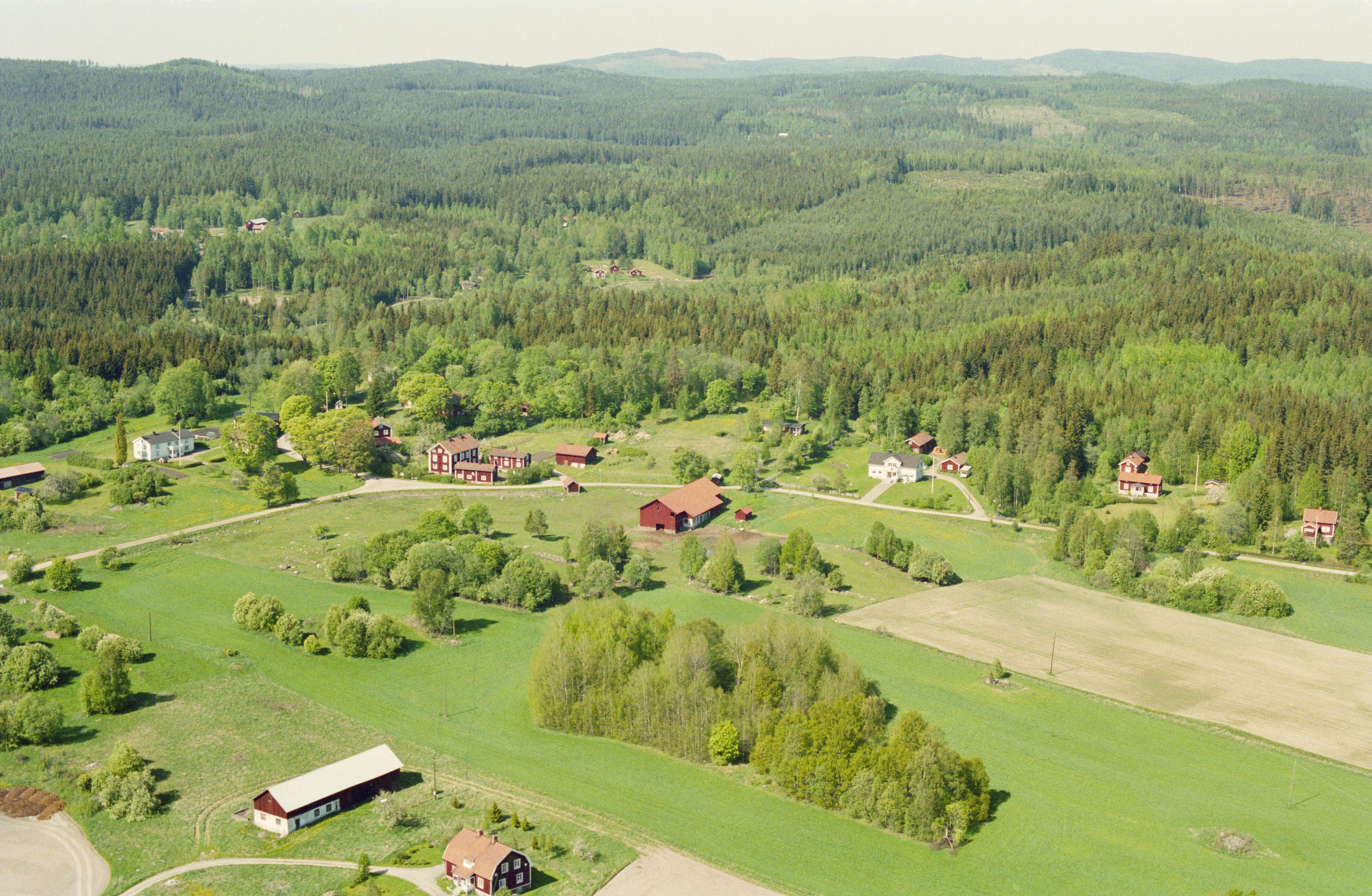 Beskrivning: Lindesby. Till vänster om bildens mitt gruvområde / gruvhål RAÄnr Järnboås 146:1. Uppe till vänster hyttområde RAÄnr Järnboås 4:1. I bildens övre del Björkbergsbackens naturreservat. Bilden är tagen mot (väderstreck): NNV
