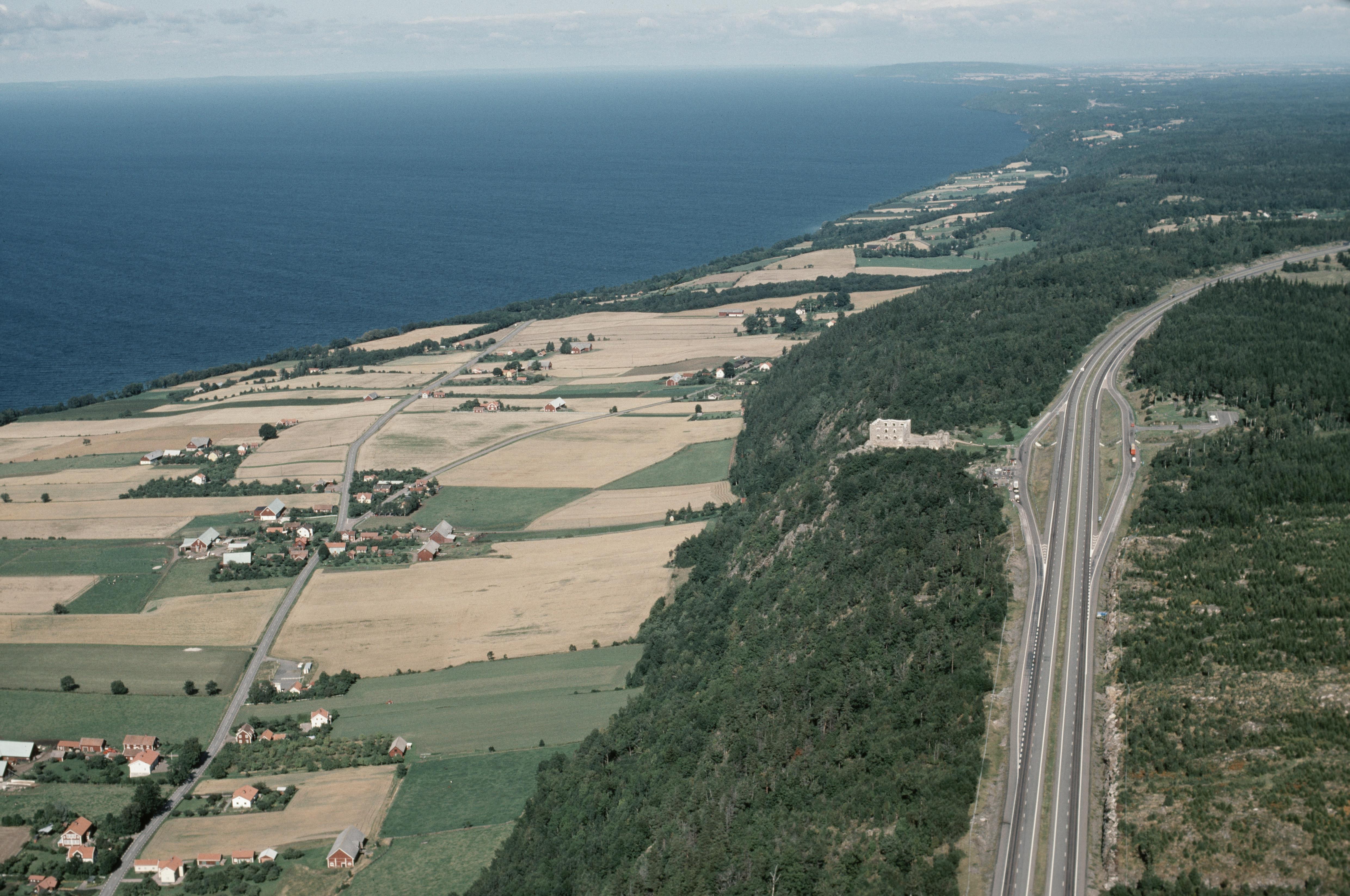 Beskrivning: Vid bildens mitt slottsruin Brahehus RAÄnr Gränna 43:1 vid väg E4. Till vänster Uppgränna by vid Vättern. Bilden är tagen mot (väderstreck): NO