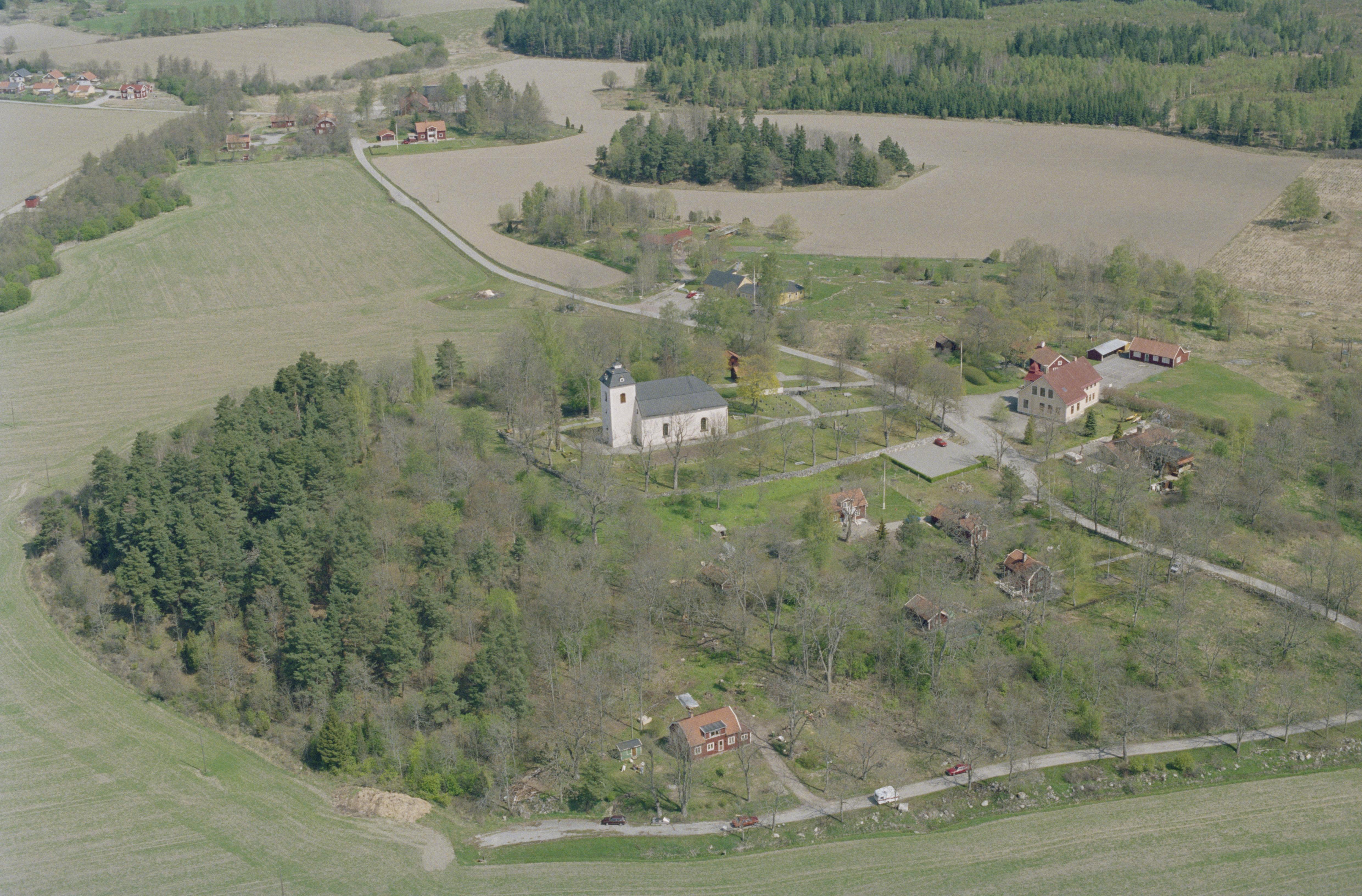 Beskrivning: Kungsåra kyrka och kyrkby. Kyrkan står i bytomt RAÄnr Kungsåra 189:1. Bilden är tagen mot (väderstreck): NNO