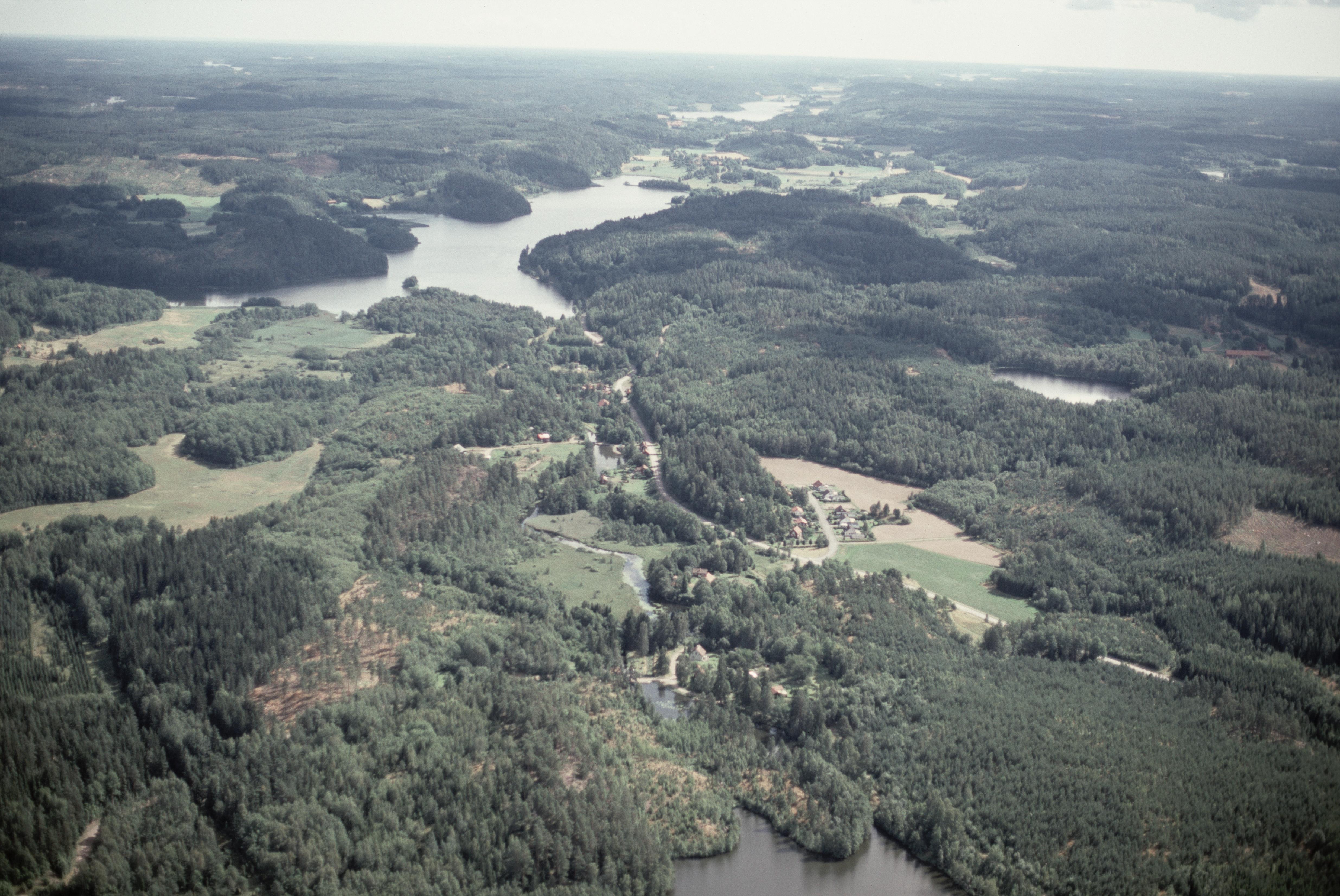 Beskrivning: Storån i Uknadalen. I bildens övre del Båtsjön och Gärdserum. Bilden är tagen mot (väderstreck): OSO