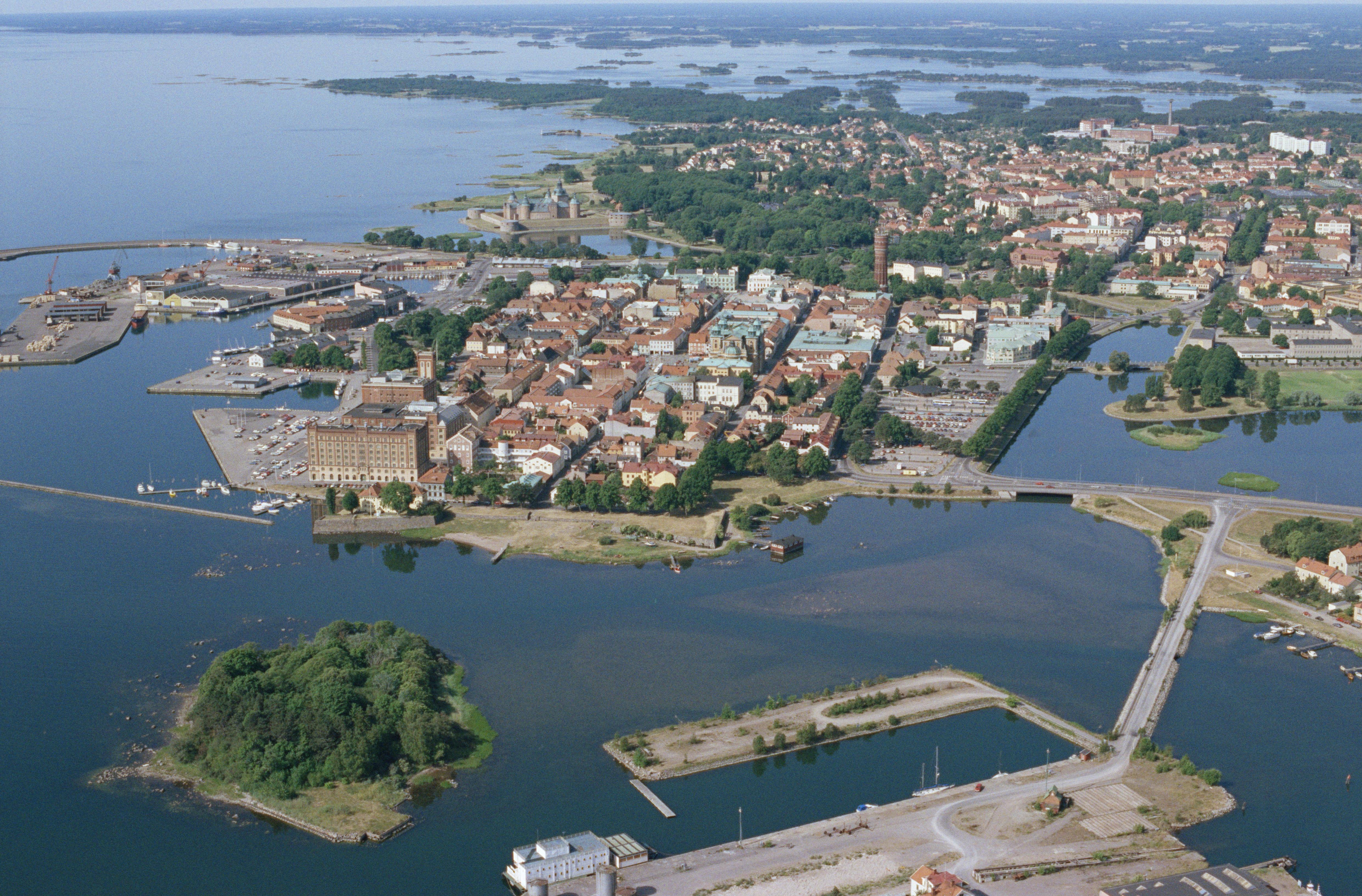 Beskrivning: Kalmar stad. Kvarnholmen med Kalmar domkyrka vid bildens mitt. Uppe till vänster Kalmar slott / borg RAÄnr Kalmar 53:1. Bilden är tagen mot (väderstreck): SV
