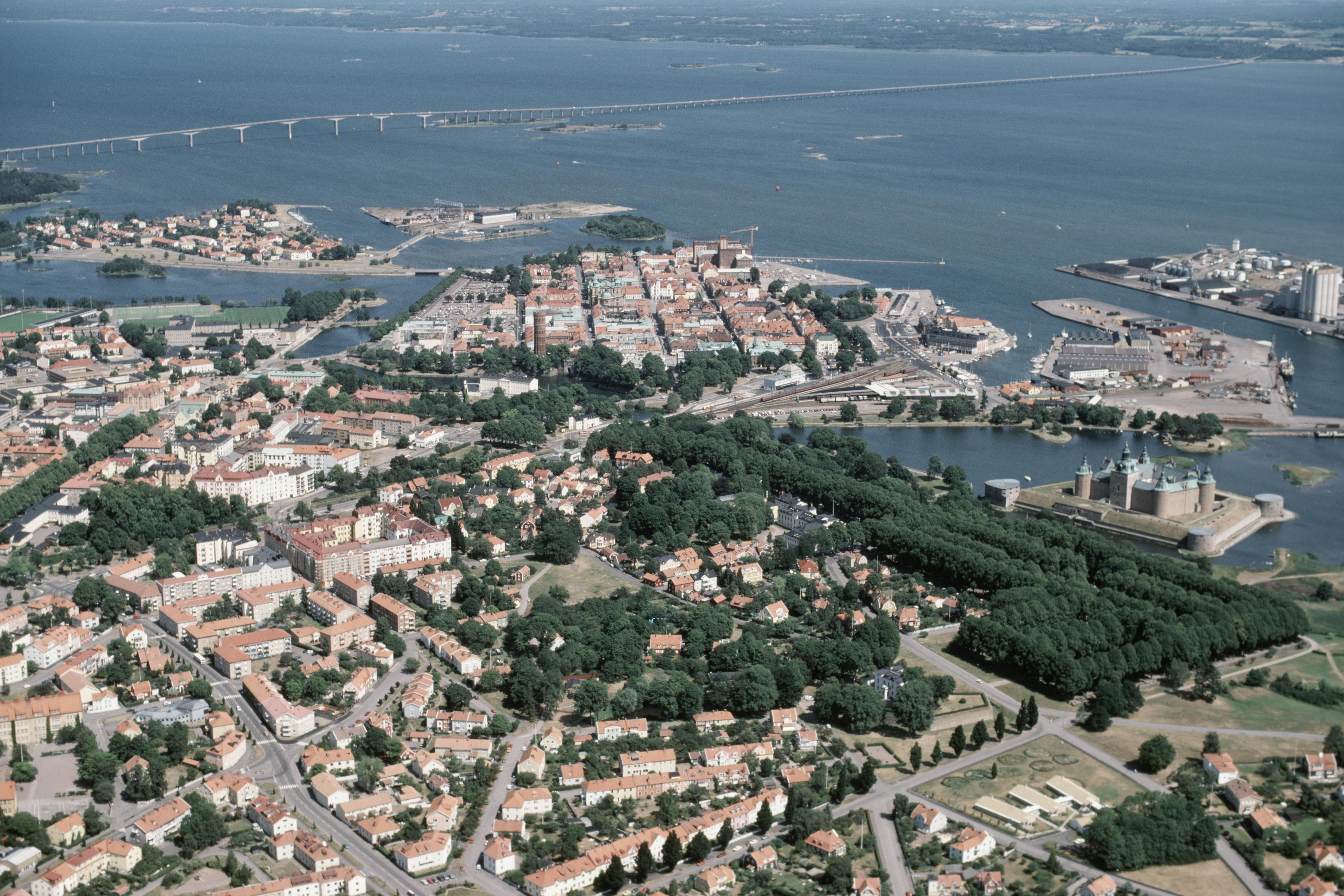 Beskrivning: Kalmar stad. Kvarnholmen med Kalmar domkyrka i bildens övre del. Kalmar slott / borg RAÄnr Kalmar 53:1 till höger om bildens mitt. Bilden är tagen mot (väderstreck): ONO