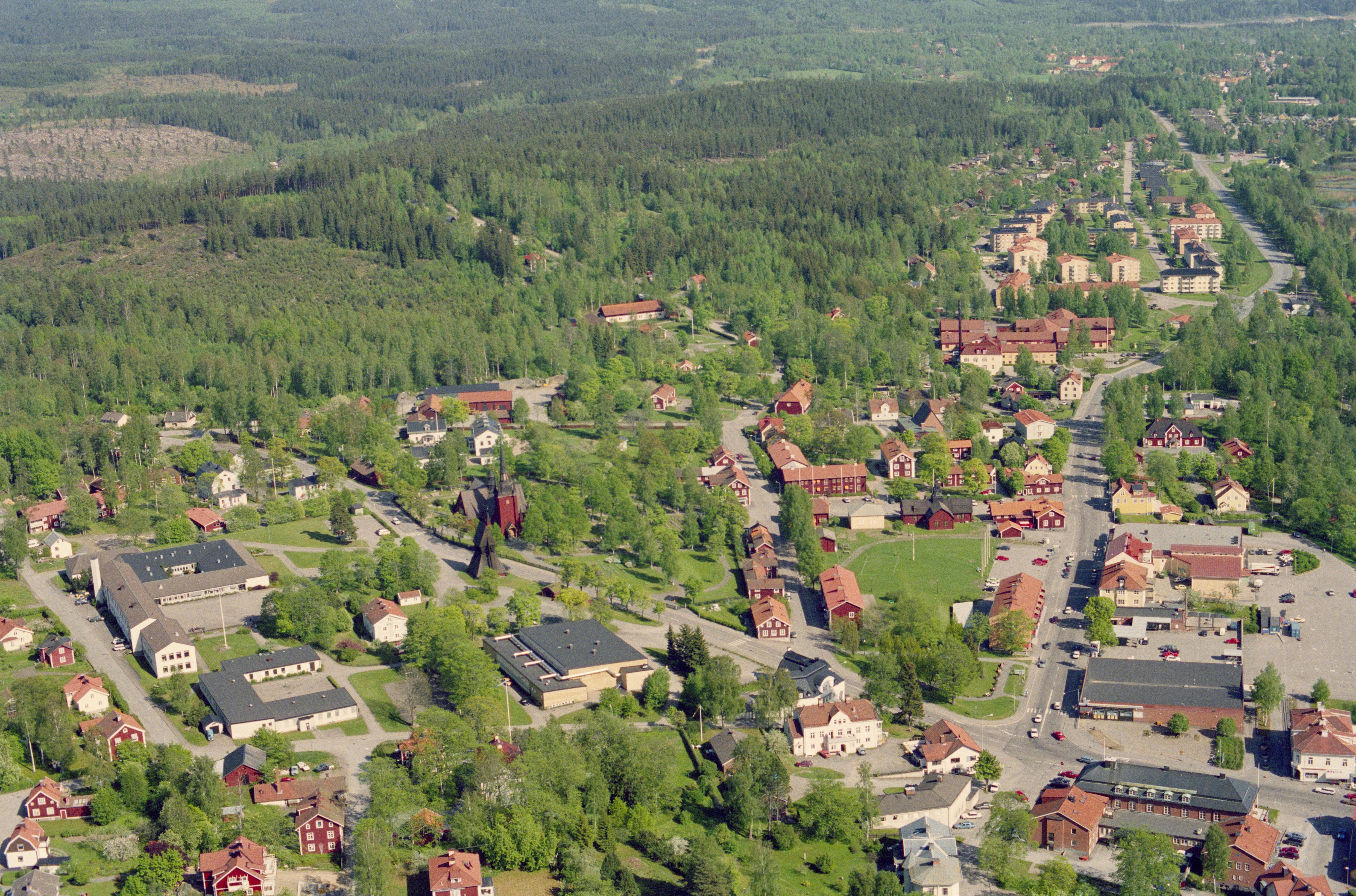 Beskrivning: Kopparbergs tätort vid Garhytteån. Till vänster under bildens mitt Ljusnarsbergs kyrka. Till höger om bildens mitt bergmästarbostället och byggnadsminnet Stora gården RAÄnr Ljusnarsberg 95:1. Bilden är tagen mot (väderstreck): OSO