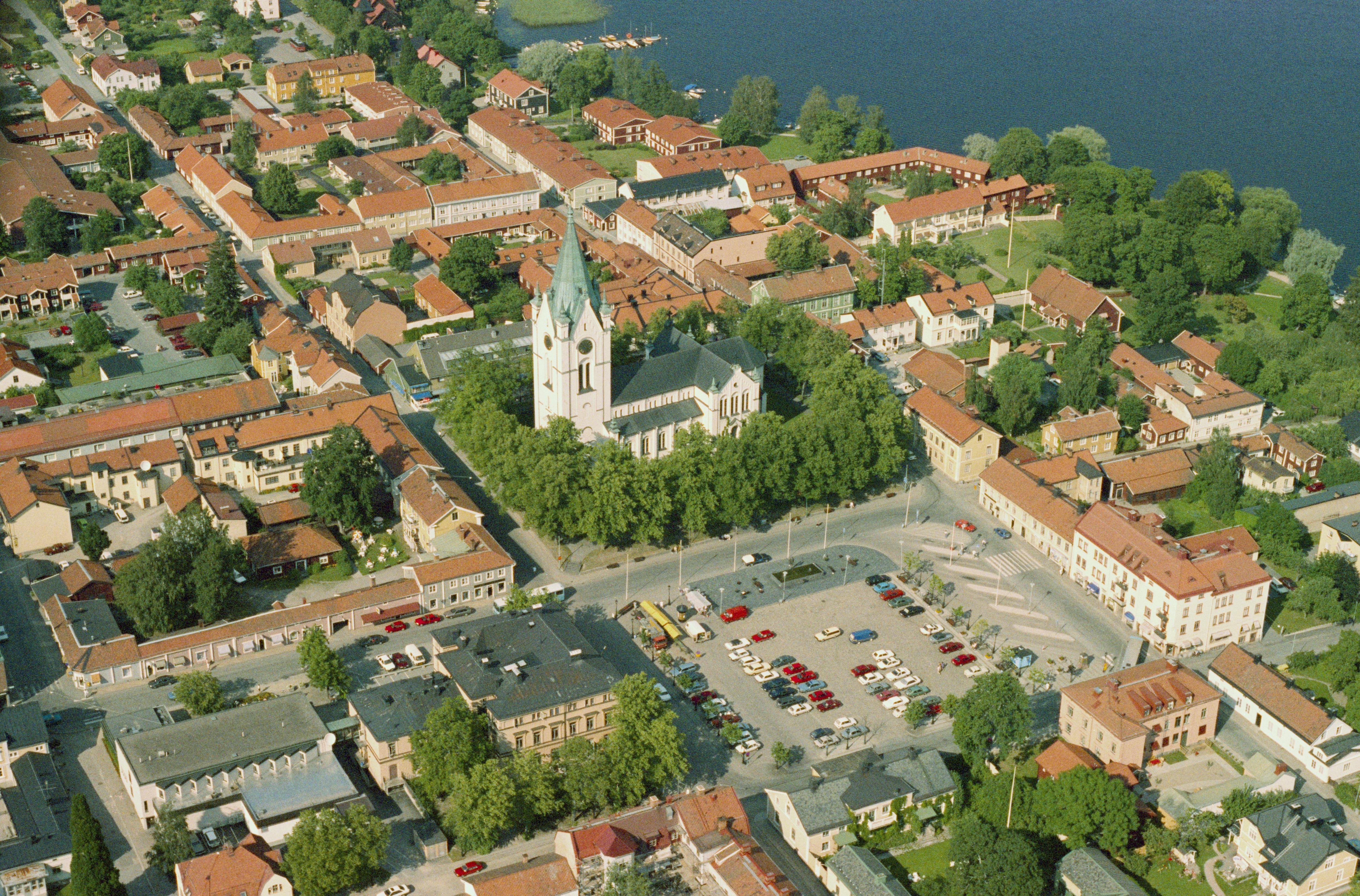 Beskrivning: Nora stad vid Hagbyån och Norasjön. Nora kyrka i bildens mitt. Stadslager RAÄnr Nora 164:1 i området vid kyrkan och Torget. Bilden är tagen mot (väderstreck): NO