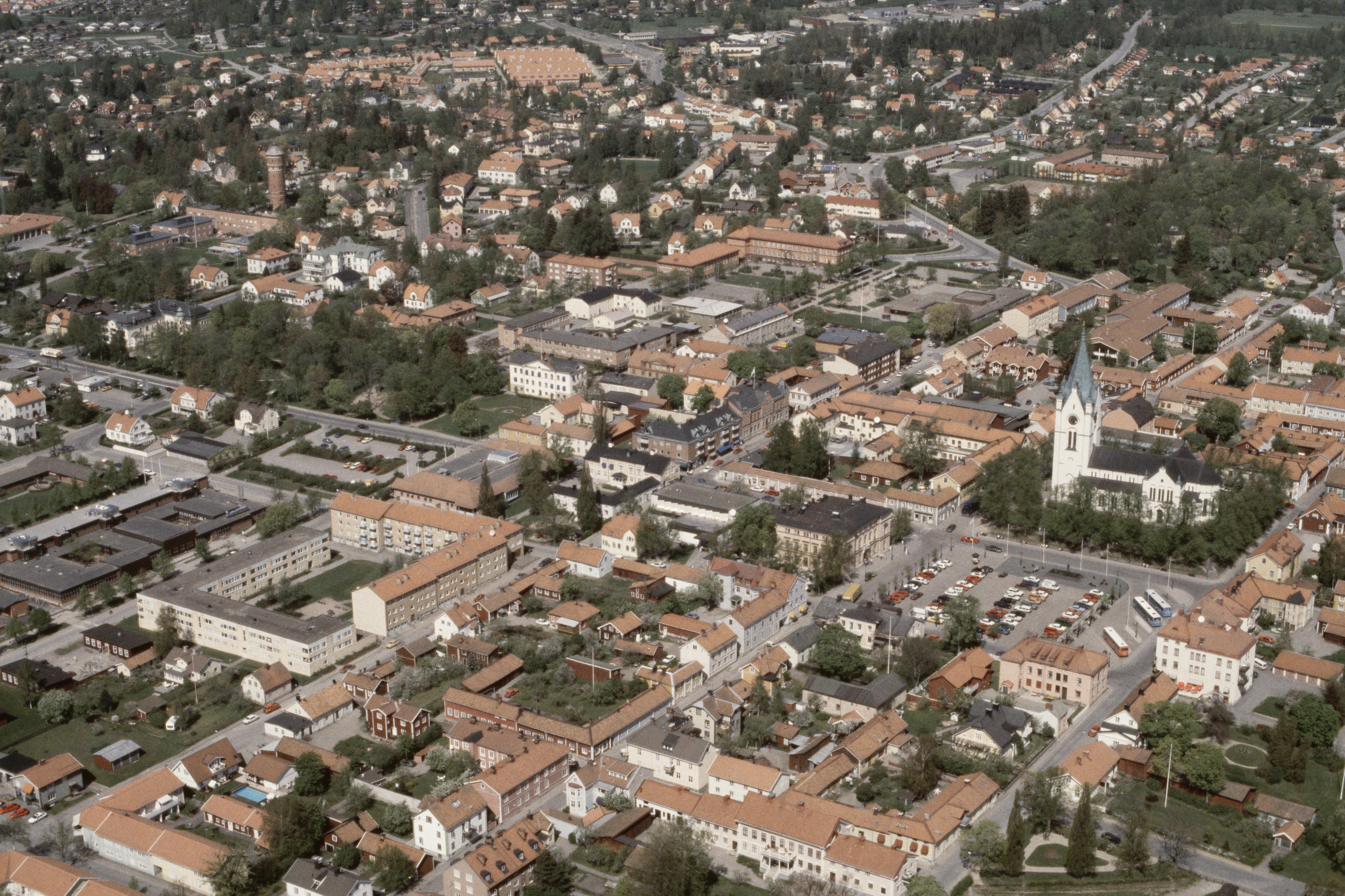 Beskrivning: Nora stad. Till vänster om bildens mitt Nora kyrka vid Torget i stadslager RAÄnr Nora 164:1. Bilden är tagen mot (väderstreck): NV
