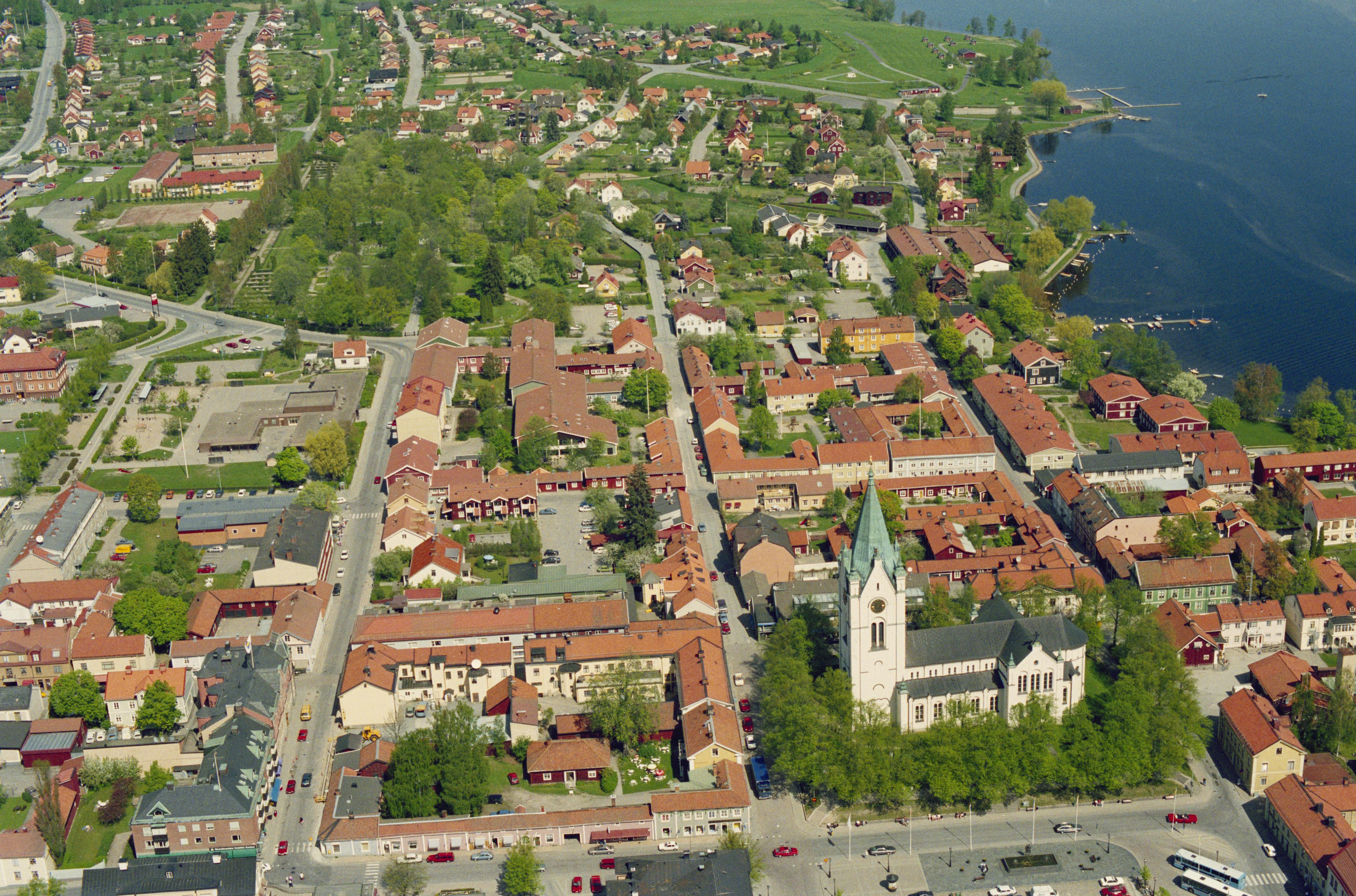 Beskrivning: Nora stad. Nere till höger Nora kyrka vid Torget i stadslager RAÄnr Nora 164:1. Bilden är tagen mot (väderstreck): N