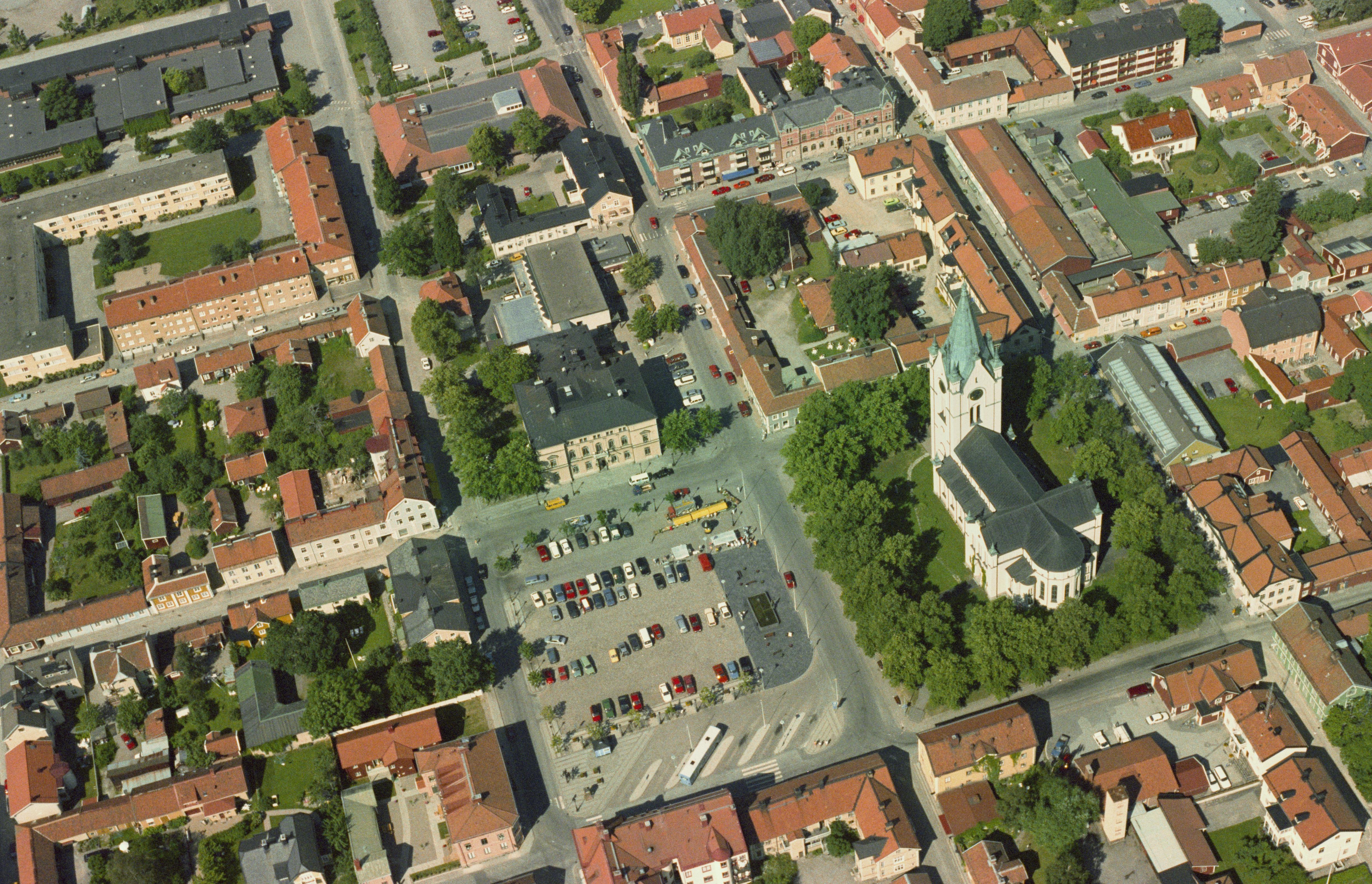 Beskrivning: Nora stad. Nora kyrka vid Torget i stadslager RAÄnr Nora 164:1. Bilden är tagen mot (väderstreck): VNV
