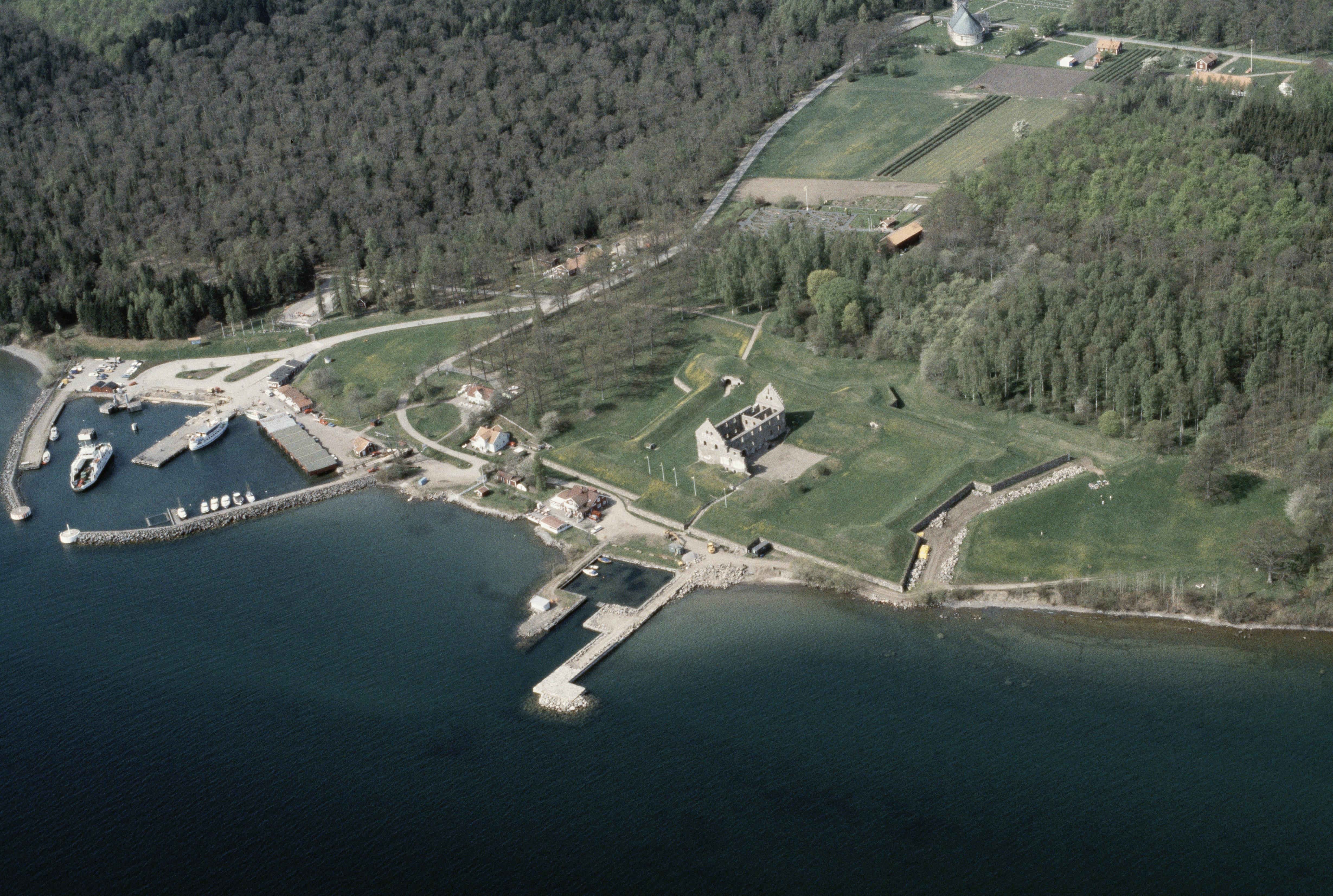 Beskrivning: Visingsö hamn. Visingsborgs slottsruin RAÄnr Visingsö 37:1 och Brahekyrkan. Bilden är tagen mot (väderstreck): VSV
