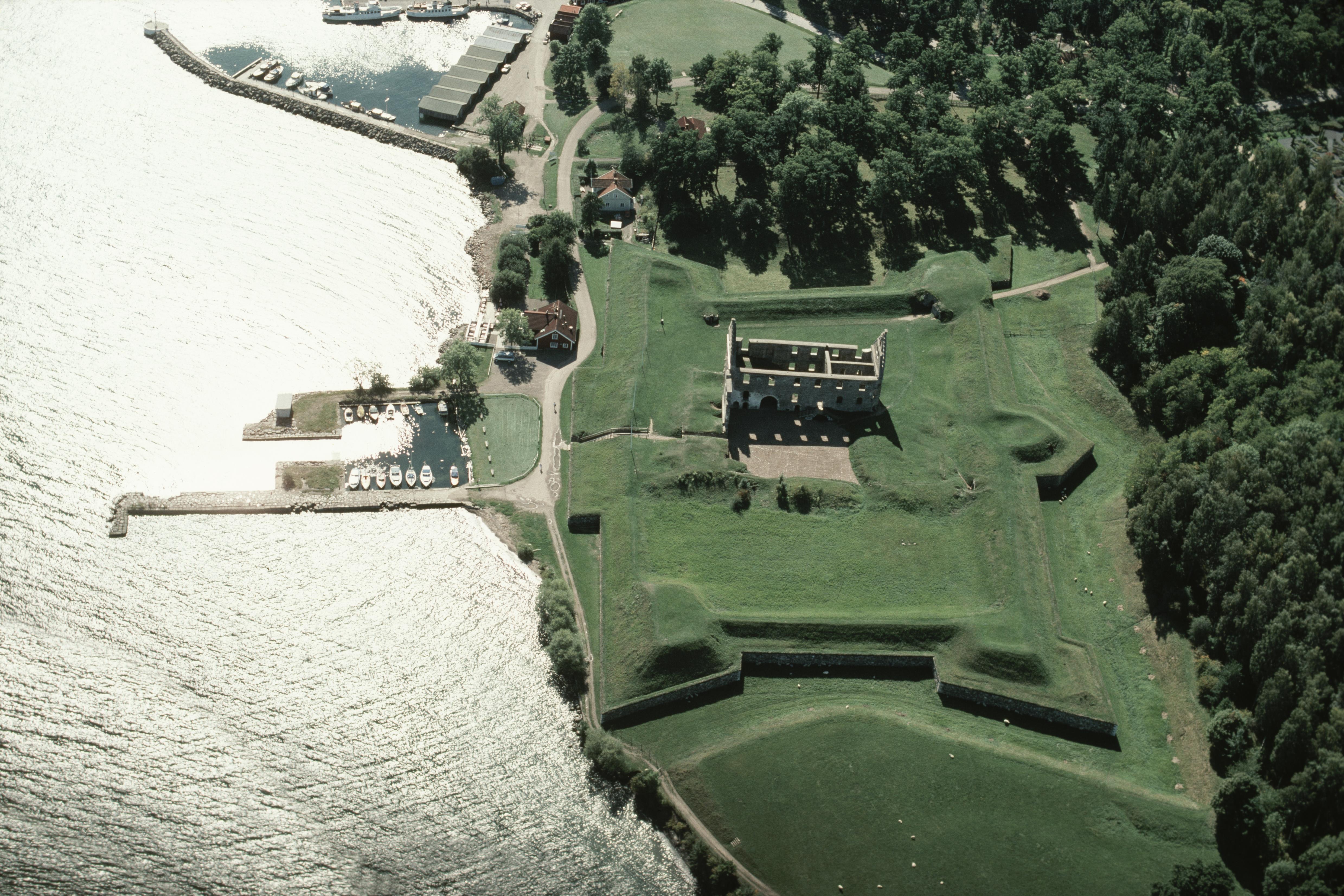Beskrivning: Visingsö hamn. Visingsborgs slottsruin RAÄnr Visingsö 37:1. Bilden är tagen mot (väderstreck): SSV