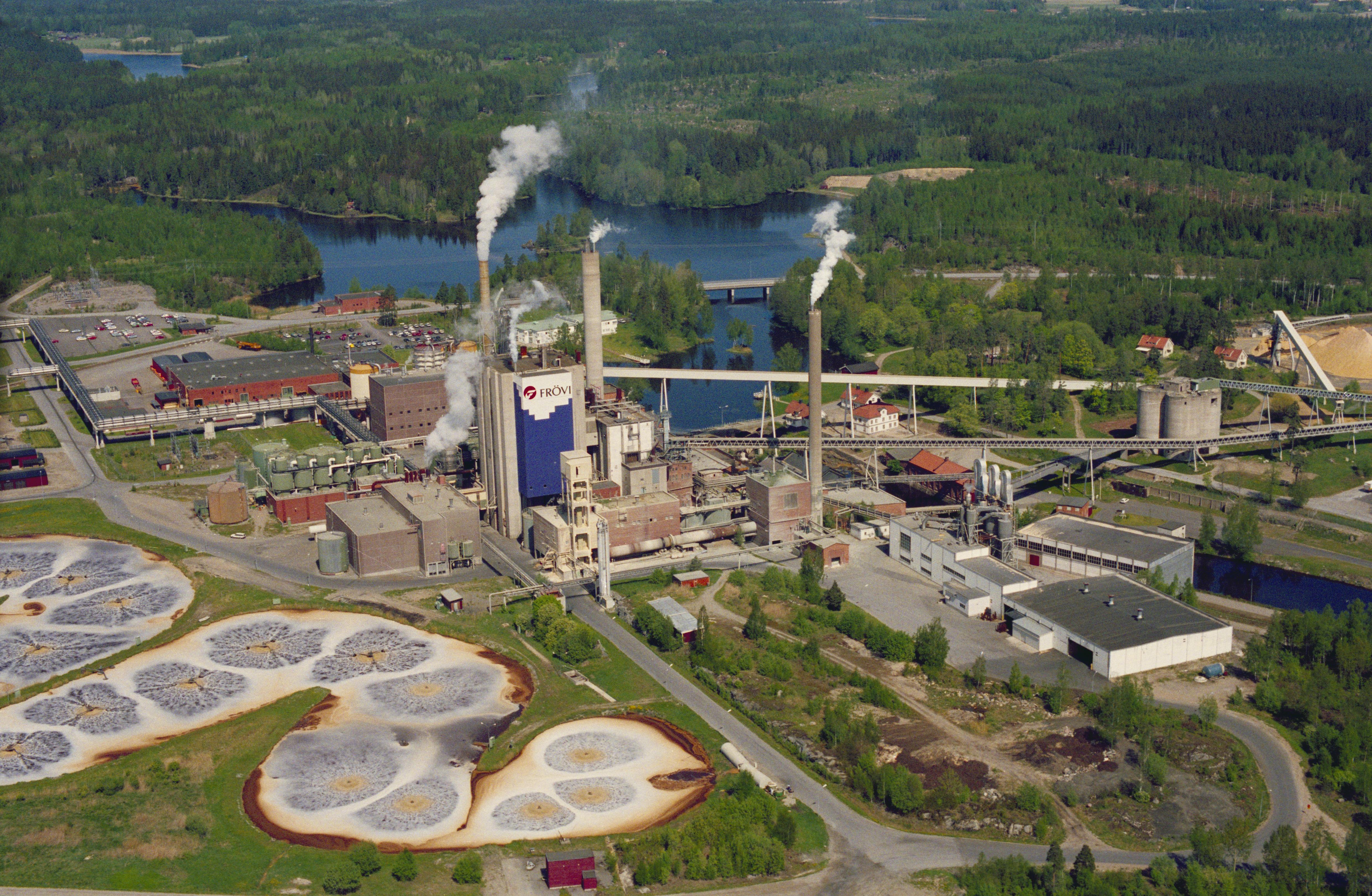 Beskrivning: Frövifors pappersbruk i Fröviåns dalgång. Reningsbassäng nere till vänster. Frövifors herrgård till höger om bildens mitt. I området fornminnen träindustri RAÄnr Näsby 123, hammarområde Näsby 121, kvarn Näsby 122 m.fl. Bilden är tagen mot (väderstreck): N