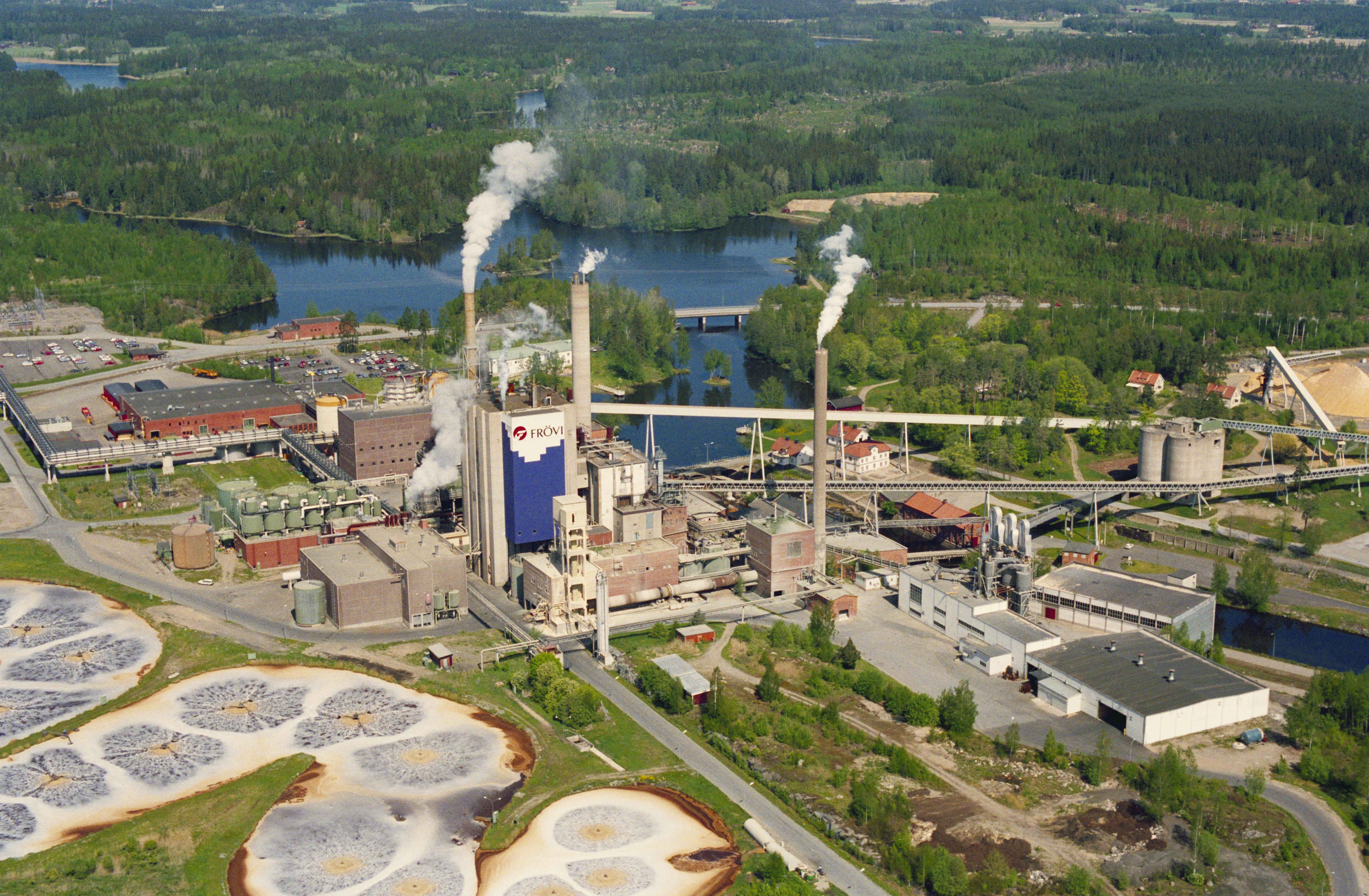 Beskrivning: Frövifors pappersbruk i Fröviåns dalgång. Reningsbassäng nere till vänster. Frövifors herrgård till höger om bildens mitt. I området fornminnen träindustri RAÄnr Näsby 123, hammarområde Näsby 121, kvarn Näsby 122 m.fl. Bilden är tagen mot (väderstreck): N