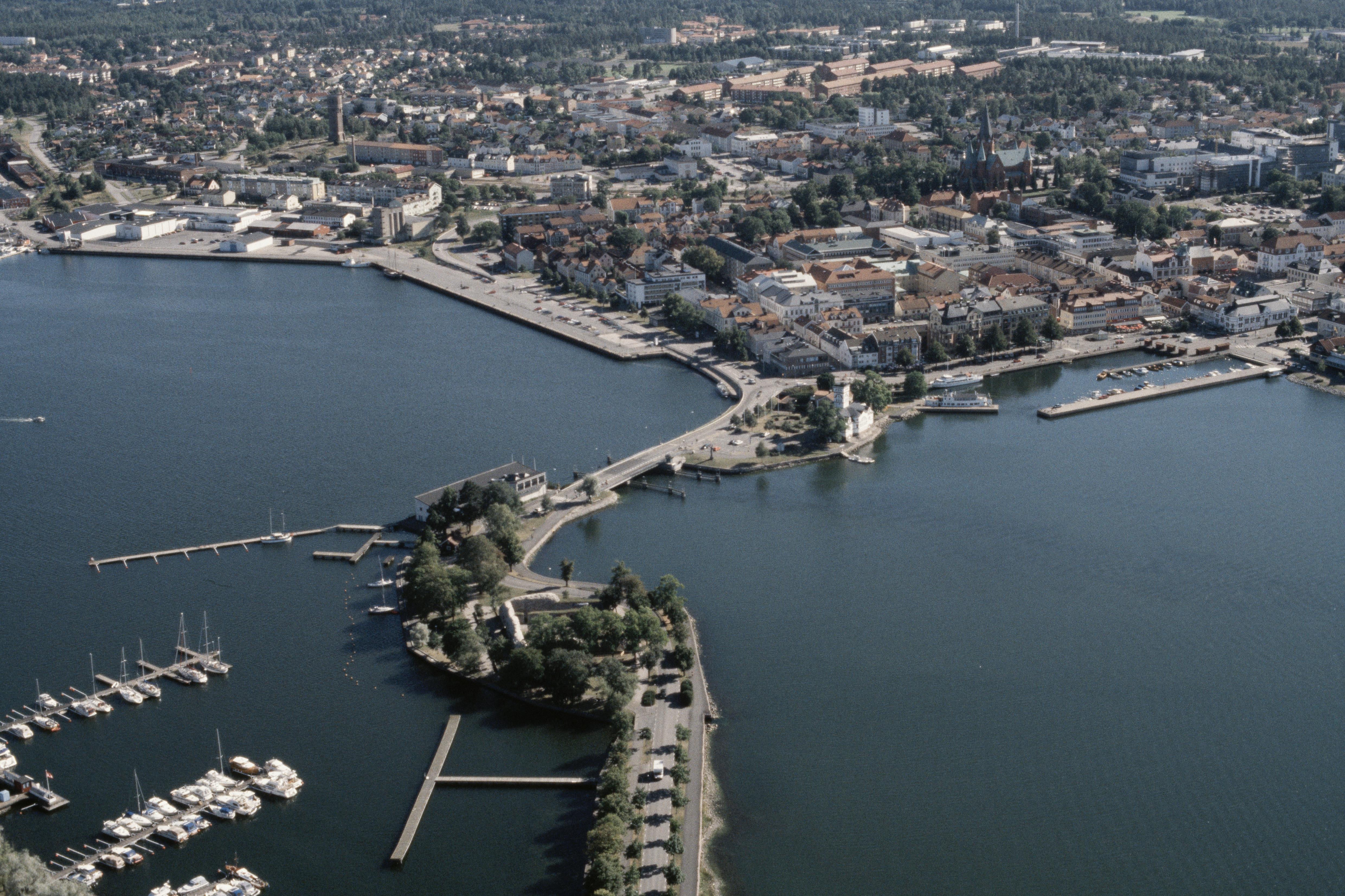 Beskrivning: Västerviks stad. Slottsruinen Stegeholm RAÄnr Västervik 51:1 vid bildens mitt. Bilden är tagen mot (väderstreck): NV