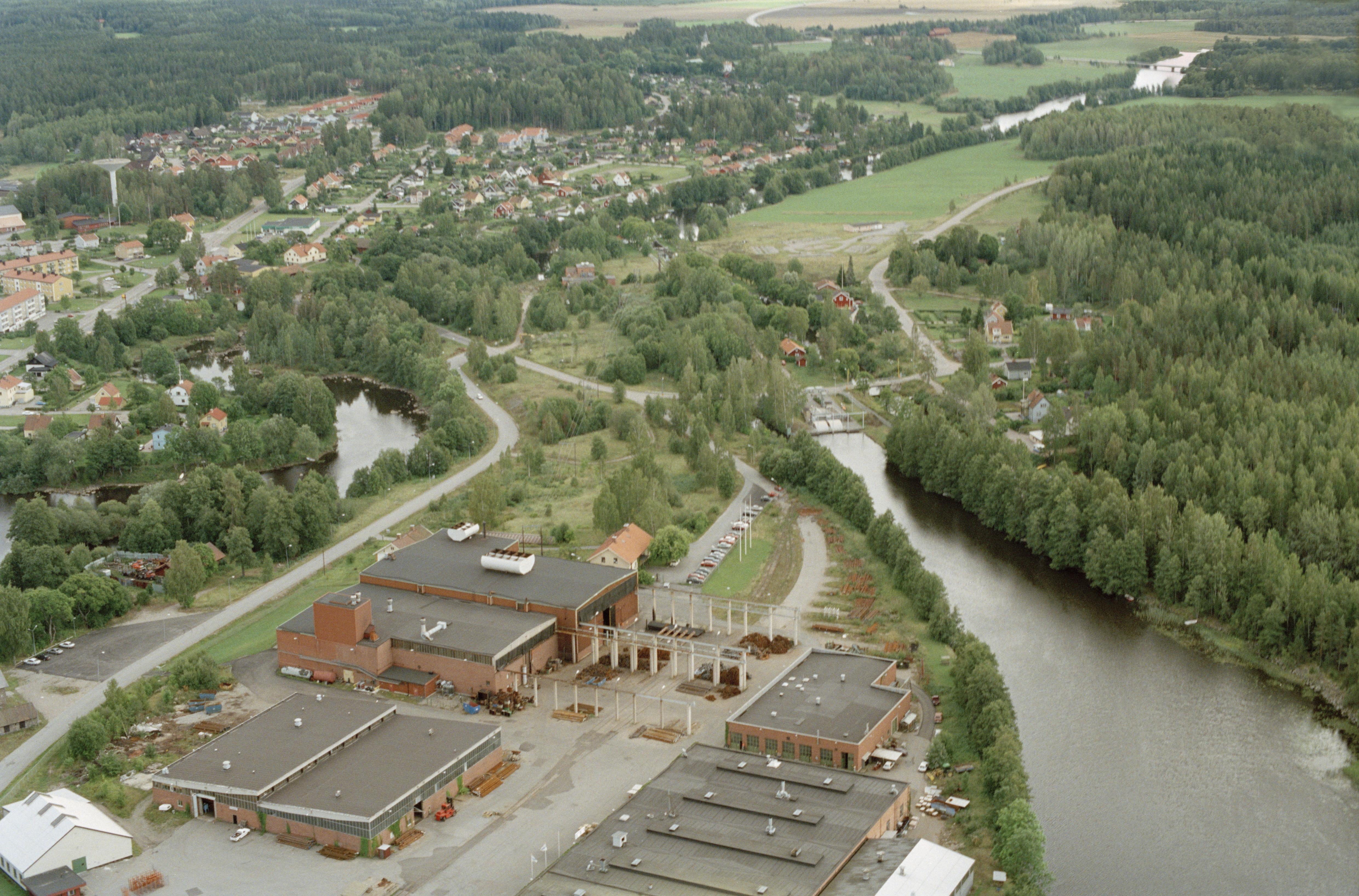 Beskrivning: Ramnäs tätort. Ramnäs bruk mellan Kolbäcksån (till vänster) och byggnadsminnet Strömsholms kanal (till höger). I bildens nedre del hammarområde RAÄnr Ramnäs 32:1 och 87:1. Bilden är tagen mot (väderstreck): SO