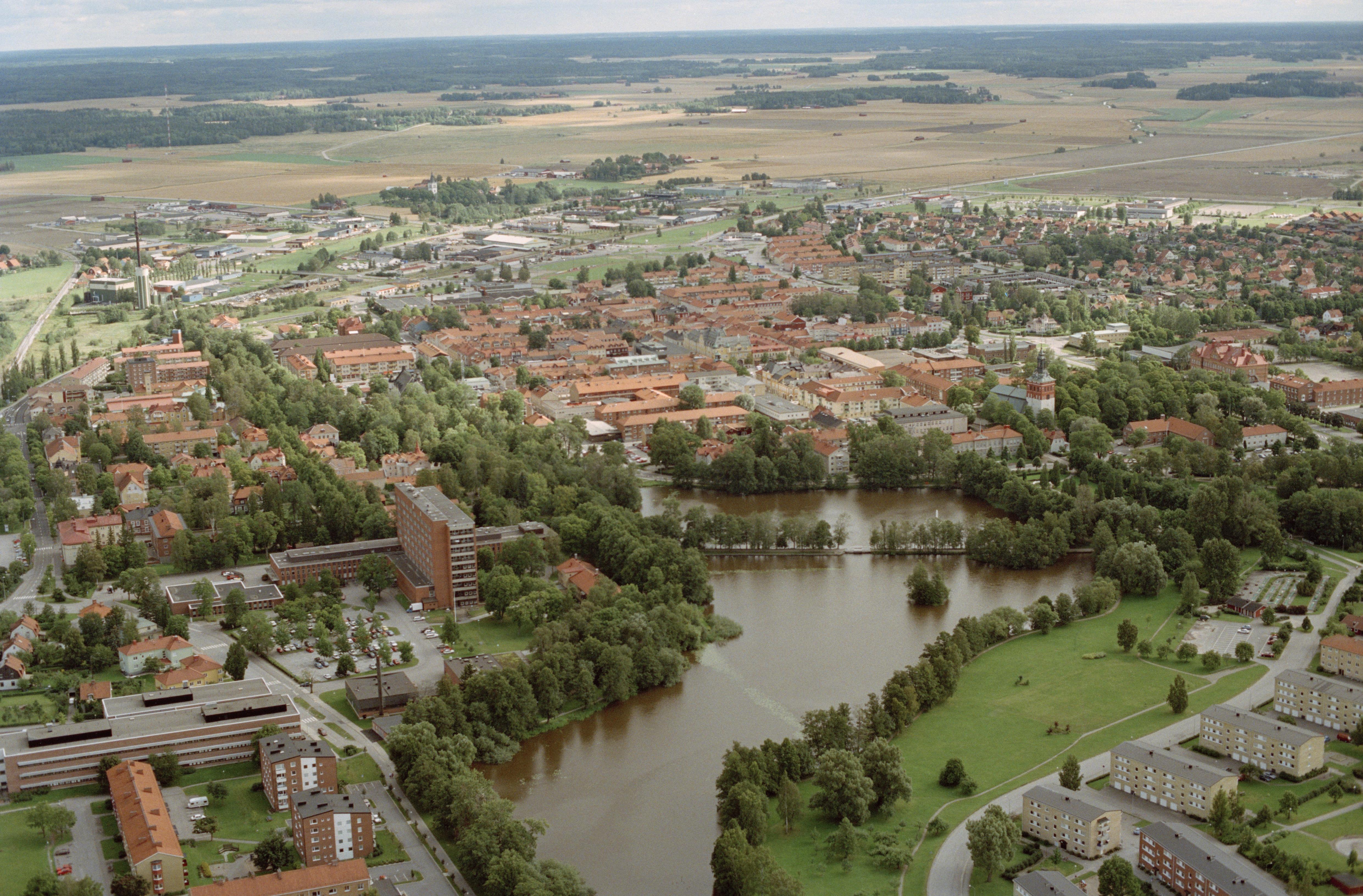Beskrivning: Sala stad och stadskärna RAÄnr Sala stad 137:1. Till höger om bildens mitt Kristina kyrka vid Ekeby damm och. Lillån. Bilden är tagen mot (väderstreck): SO