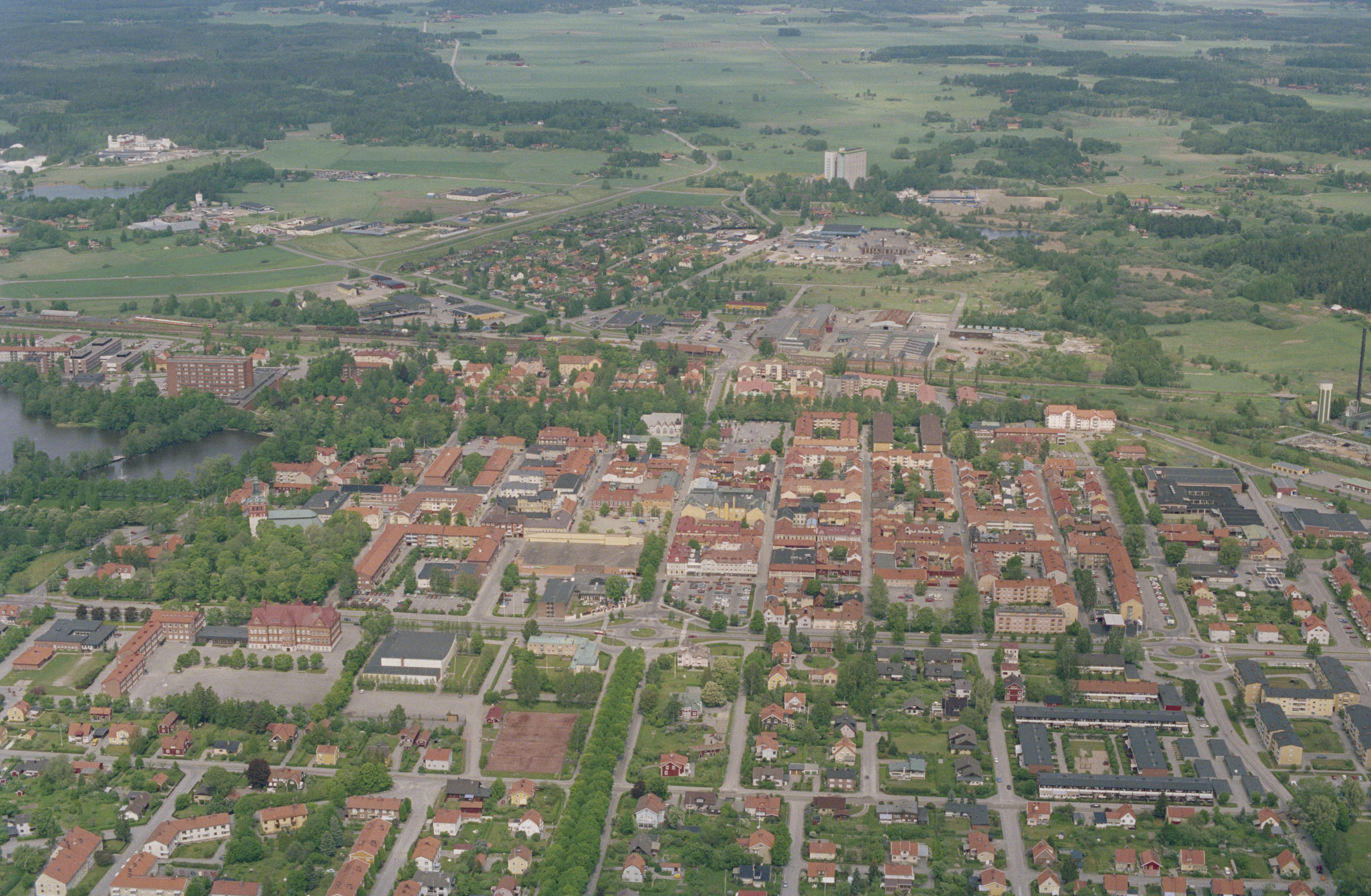 Beskrivning: Sala stad och stadskärna RAÄnr Sala stad 137:1. Till vänster om bildens mitt Kristina kyrka vid Ekeby damm. Lillån längs bildens mitt. Bilden är tagen mot (väderstreck): NO