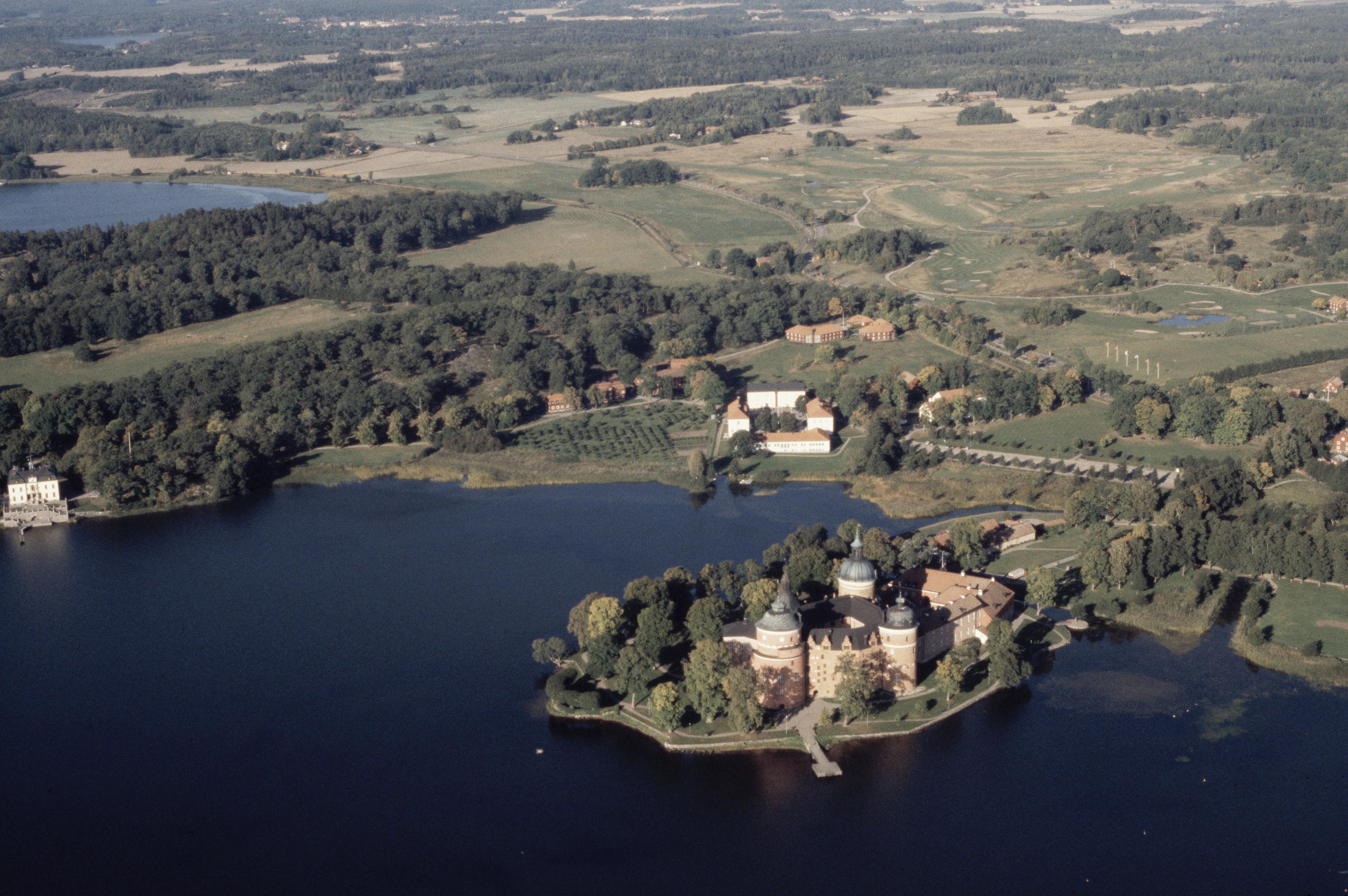 Beskrivning: Vid sockengränsen mellan Kärnbo och Mariefred (nere till höger). Kungsladugården och Gripsholms slott. Bilden är tagen mot (väderstreck): V