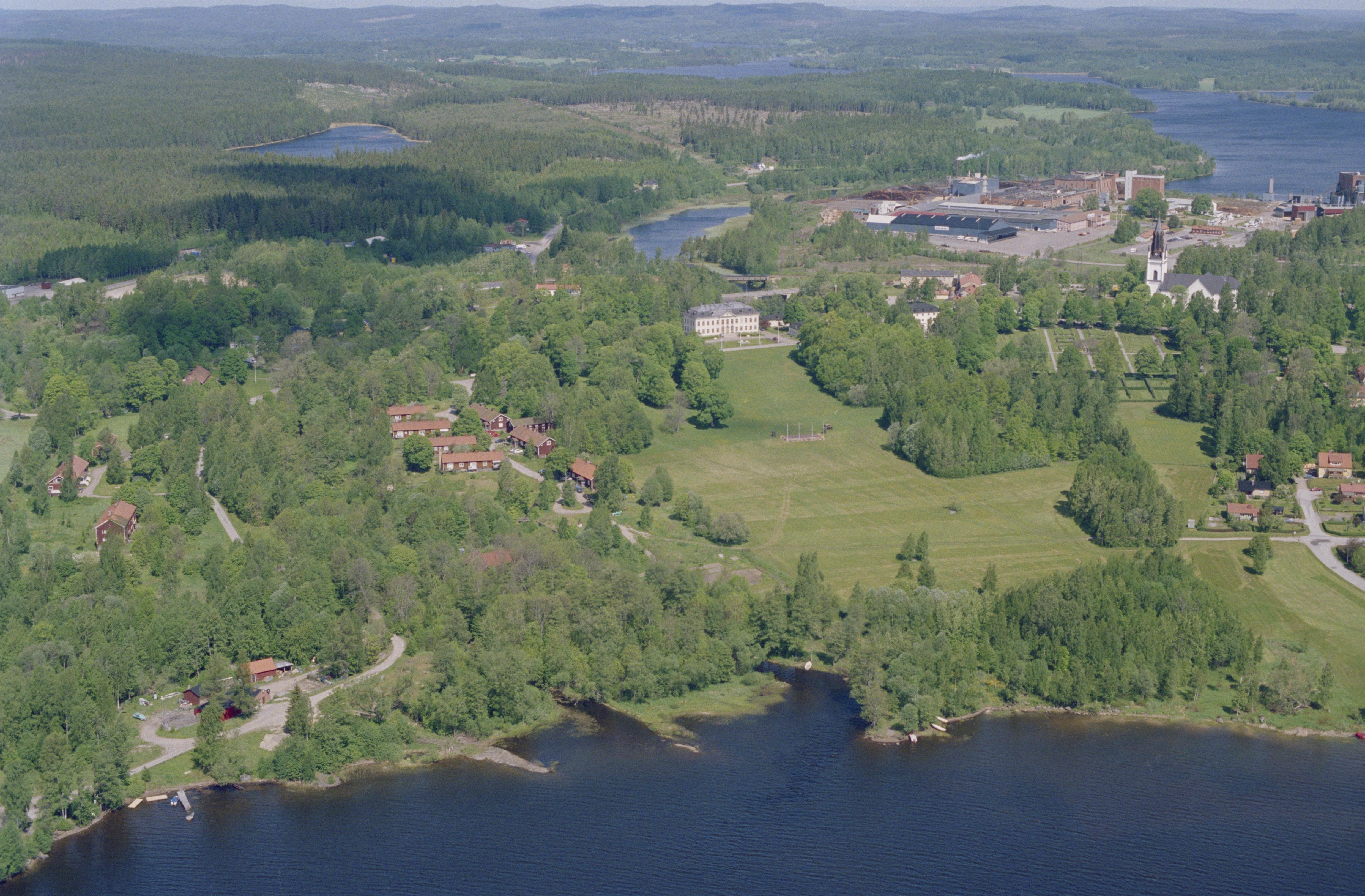 Beskrivning: Skinnskattebergs bruk och tätort mellan sjöarna Övre Vättern och Nedre Vättern. Över bildens mitt byggnadsminnet Skinnskattebergs herrgård och till höger Skinnskattebergs kyrka. Till vänster om bildens mitt hammarområde RAÄnr Skinnskatteberg 43:1. Bilden är tagen mot (väderstreck): NNV