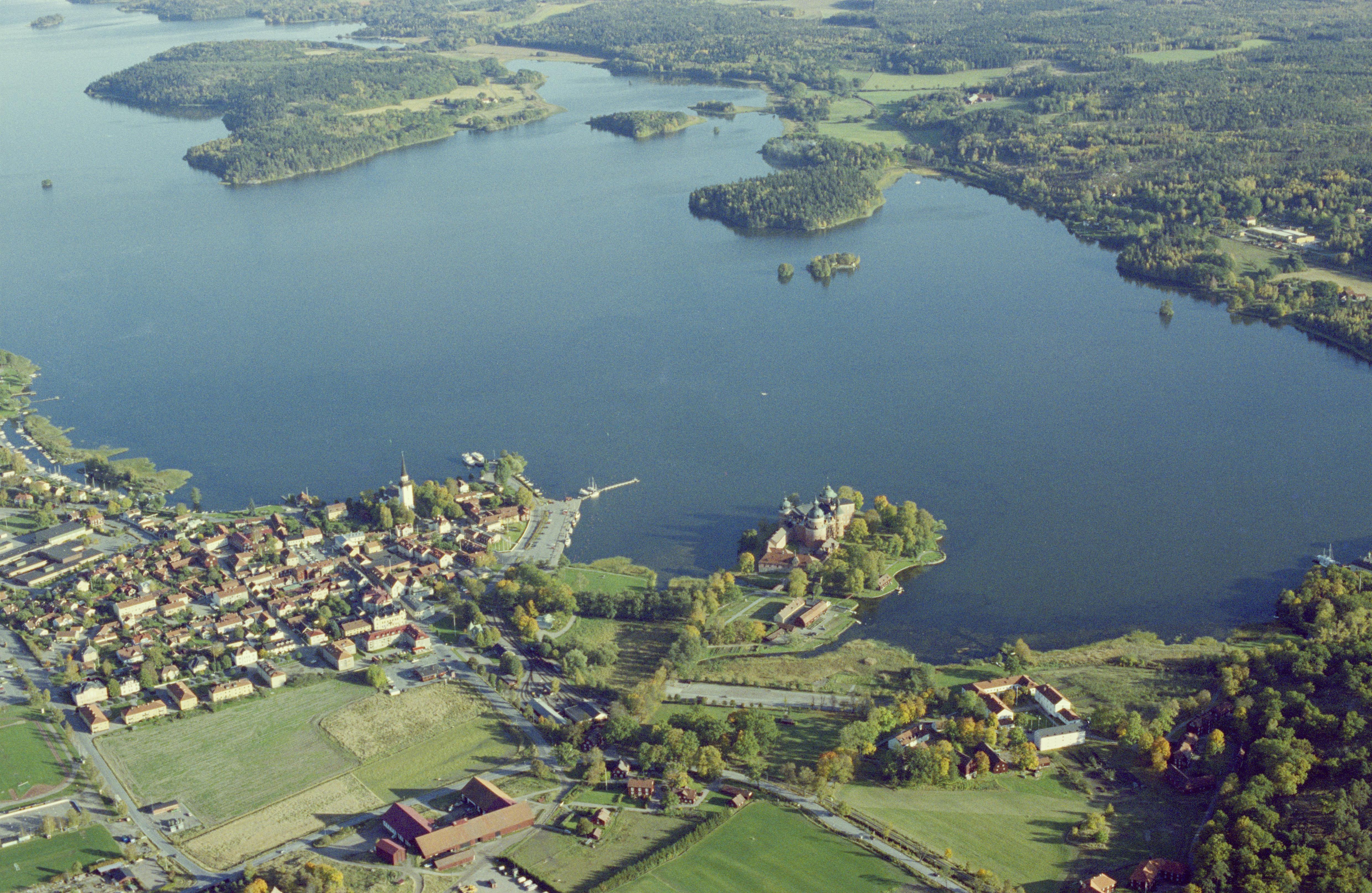 Beskrivning: Mariefreds stad vid gränsen till Kärnbo socken (i bildens högra del). Vid bildens mitt Gripsholms slott och Kungsladugården (i Kärnbo socken). Bilden är tagen mot (väderstreck): Ö