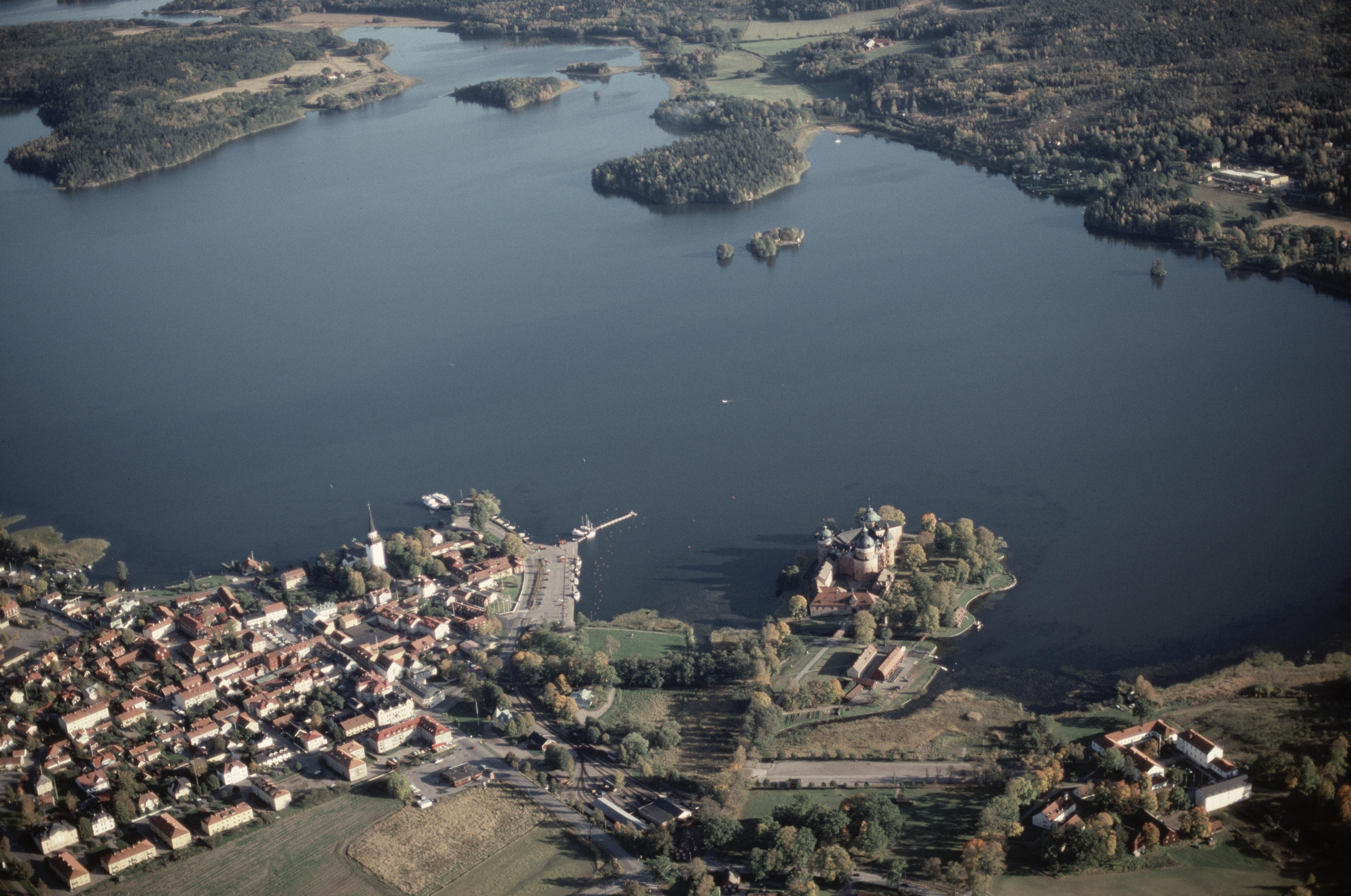 Beskrivning: Mariefreds stad vid gränsen till Kärnbo socken (i bildens högre del). Mariefreds kyrka vid bildens mitt. Gripsholms slott och Kungsladugården. Bilden är tagen mot (väderstreck): Ö