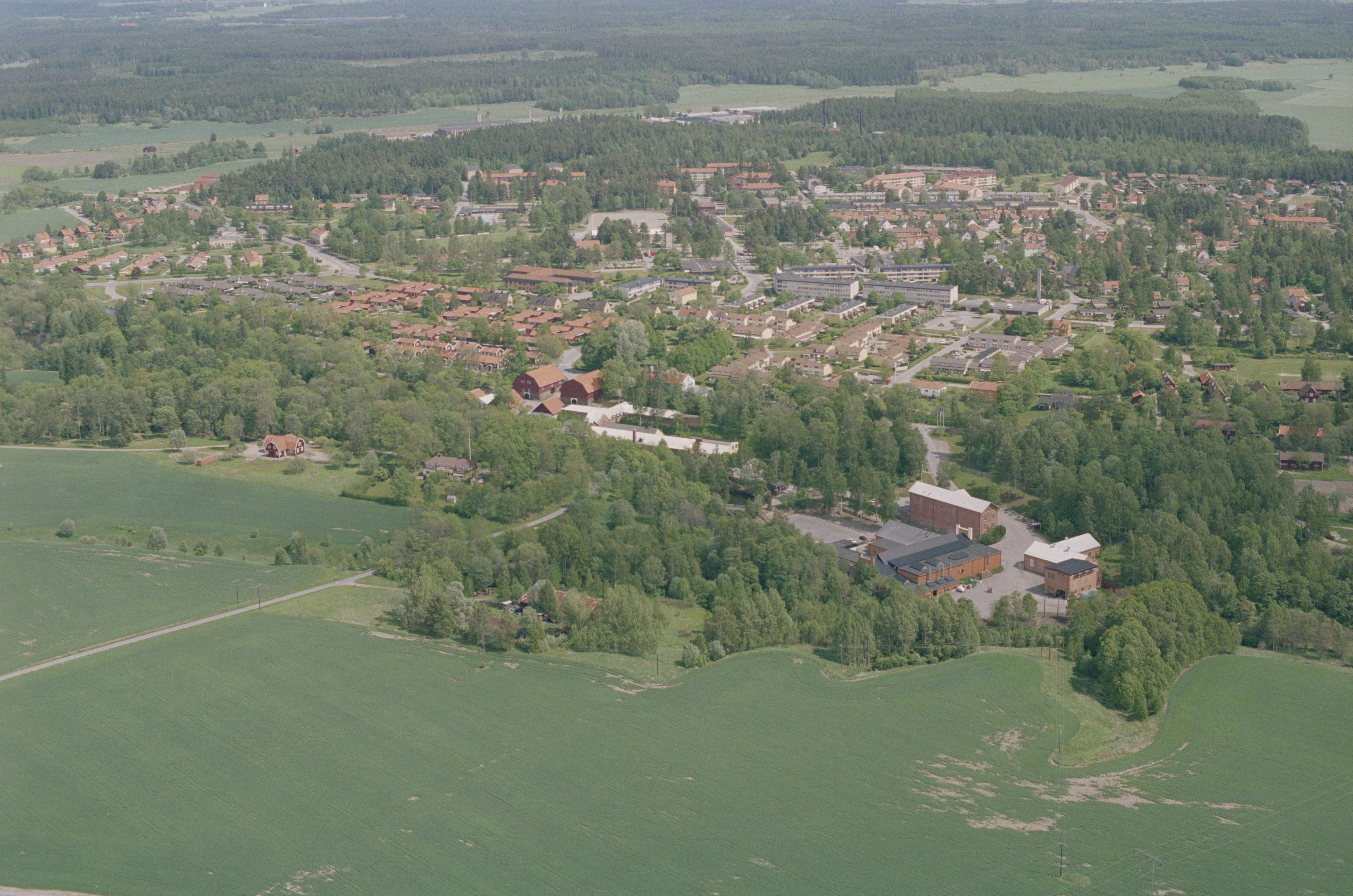 Beskrivning: Skultuna tätort och bruk i Svartåns dalgång. Vid bildens mitt brukslämningar RAÄnr Skultuna 224:1, 225:1 m.fl. Bilden är tagen mot (väderstreck): ONO