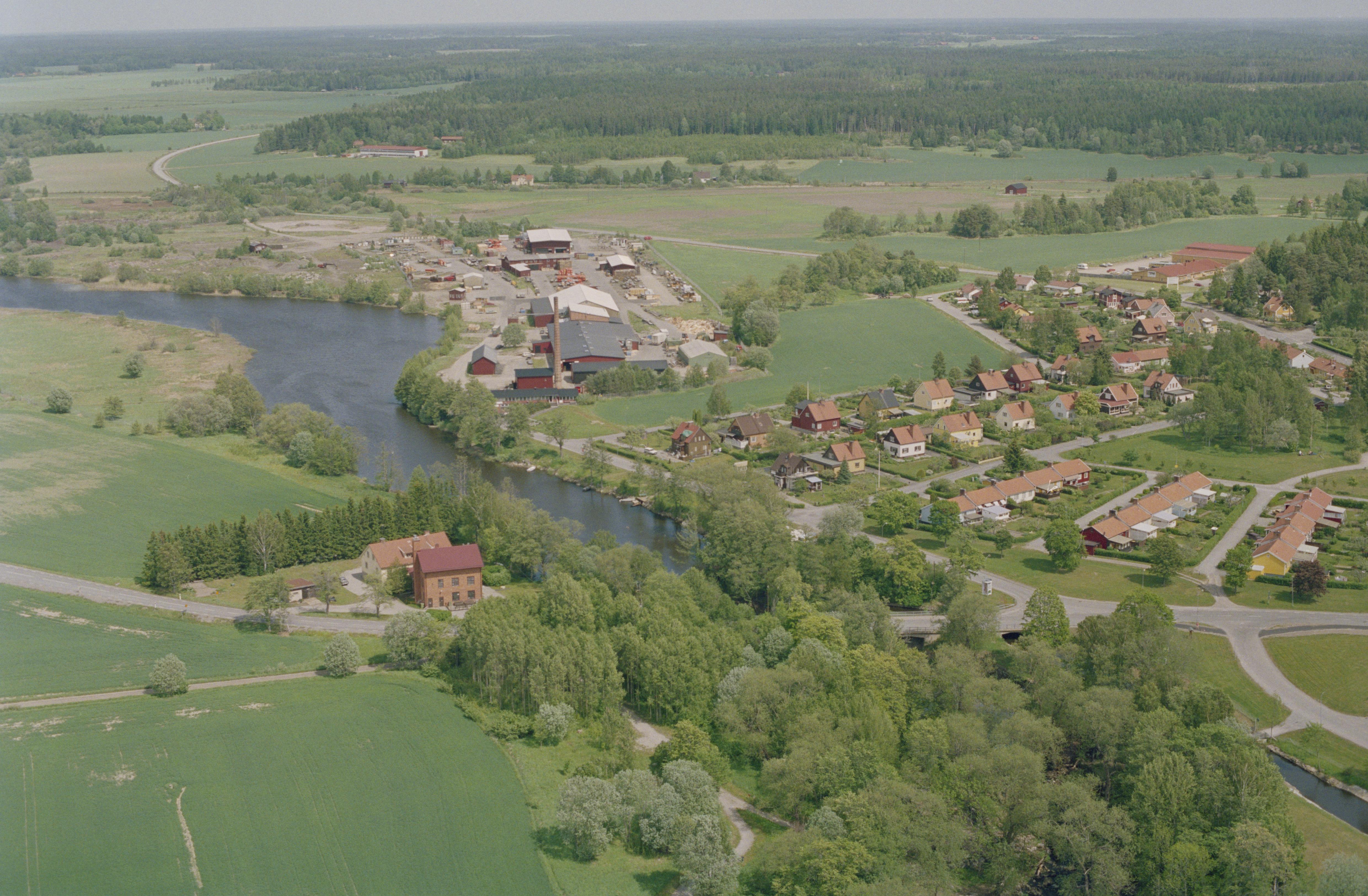 Beskrivning: Skultuna tätort och bruk i Svartåns dalgång. Under bildens mitt bro RAÄnr Skultuna 121:1 ochkvarnlämning Skultuna 344. Bilden är tagen mot (väderstreck): NNO