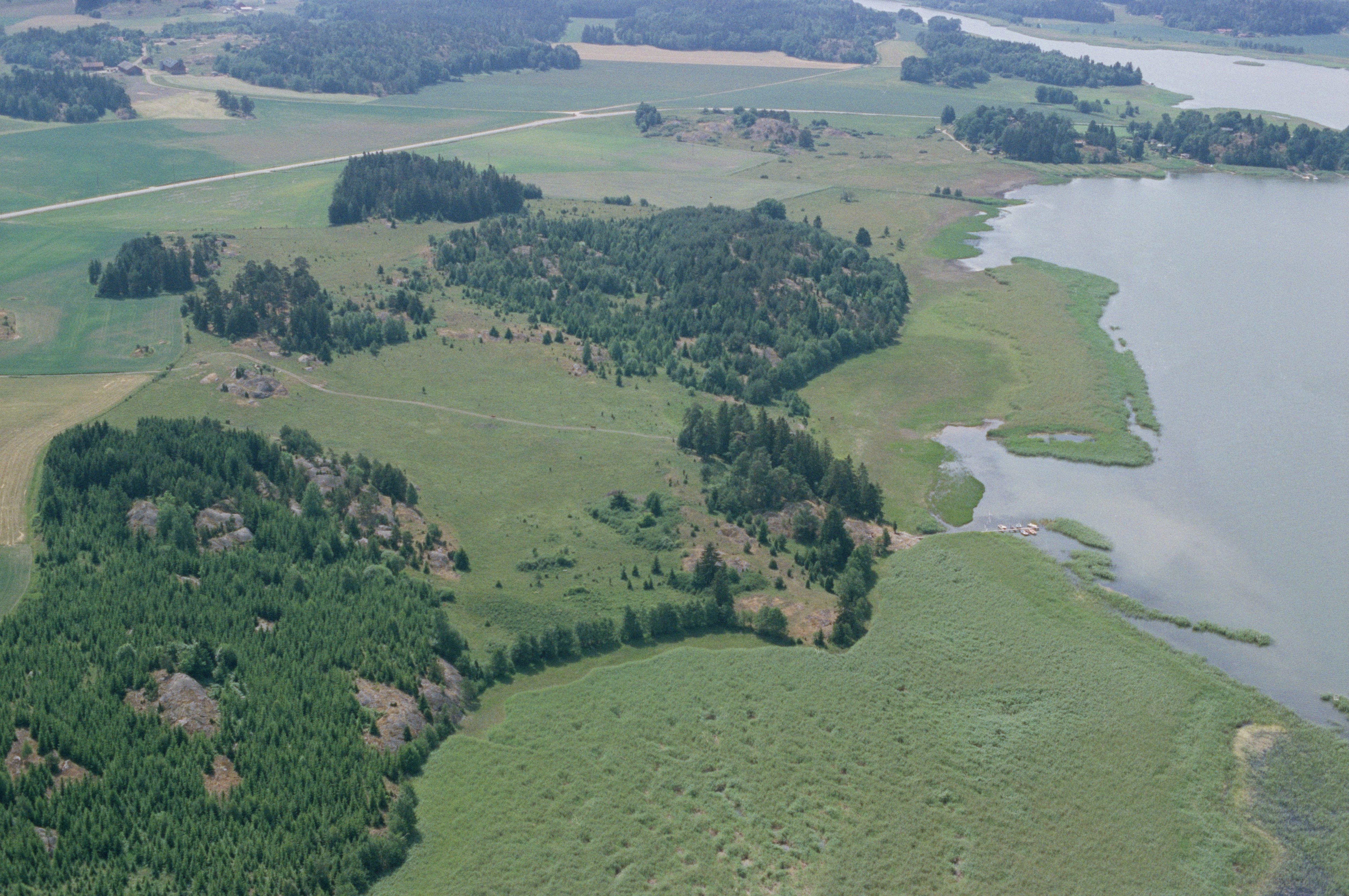 Beskrivning: Mörkö, västra delen. Ängar på Kasholmen vid Norafjärden. Vid bildens mitt gravfält RAÄnr Mörkö 82:1. Bilden är tagen mot (väderstreck): S