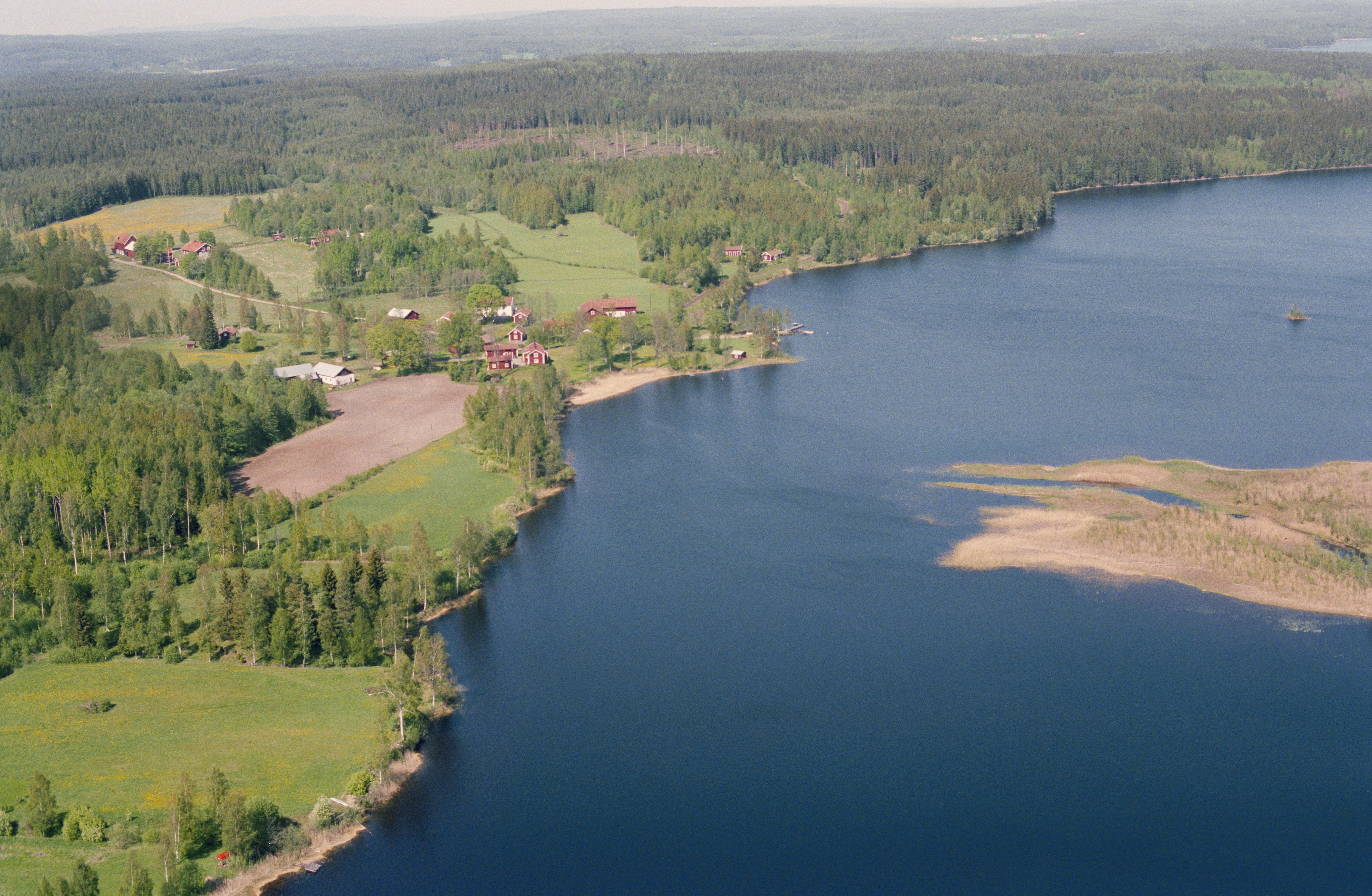 Beskrivning: Gamla Vikers bergmansby vid sjön Vikern. Hyttområde RAÄnr Viker 18:1 till vänster över bildens mitt. Bilden är tagen mot (väderstreck): N