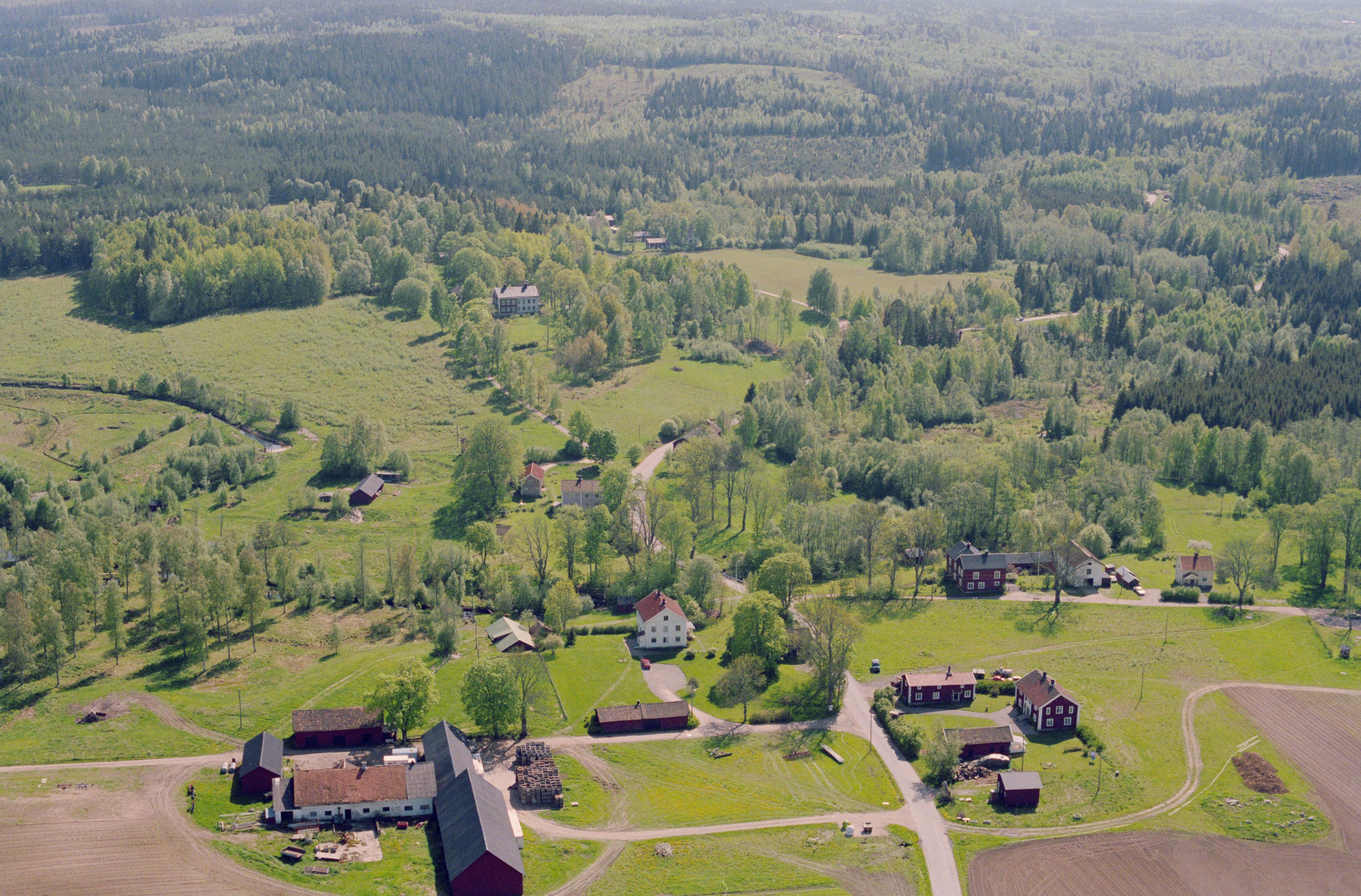 Beskrivning: Skrikarhyttans (skrivs även Skrekarhyttan) bergmansby i Mogruvälvens dalgång. Vid bildens mitt hyttområde RAÄnr Viker 11:1 vid bro Viker 82:1. Uppe till vänster gruvområde RAÄnr Viker 90:1. Bilden är tagen mot (väderstreck): S