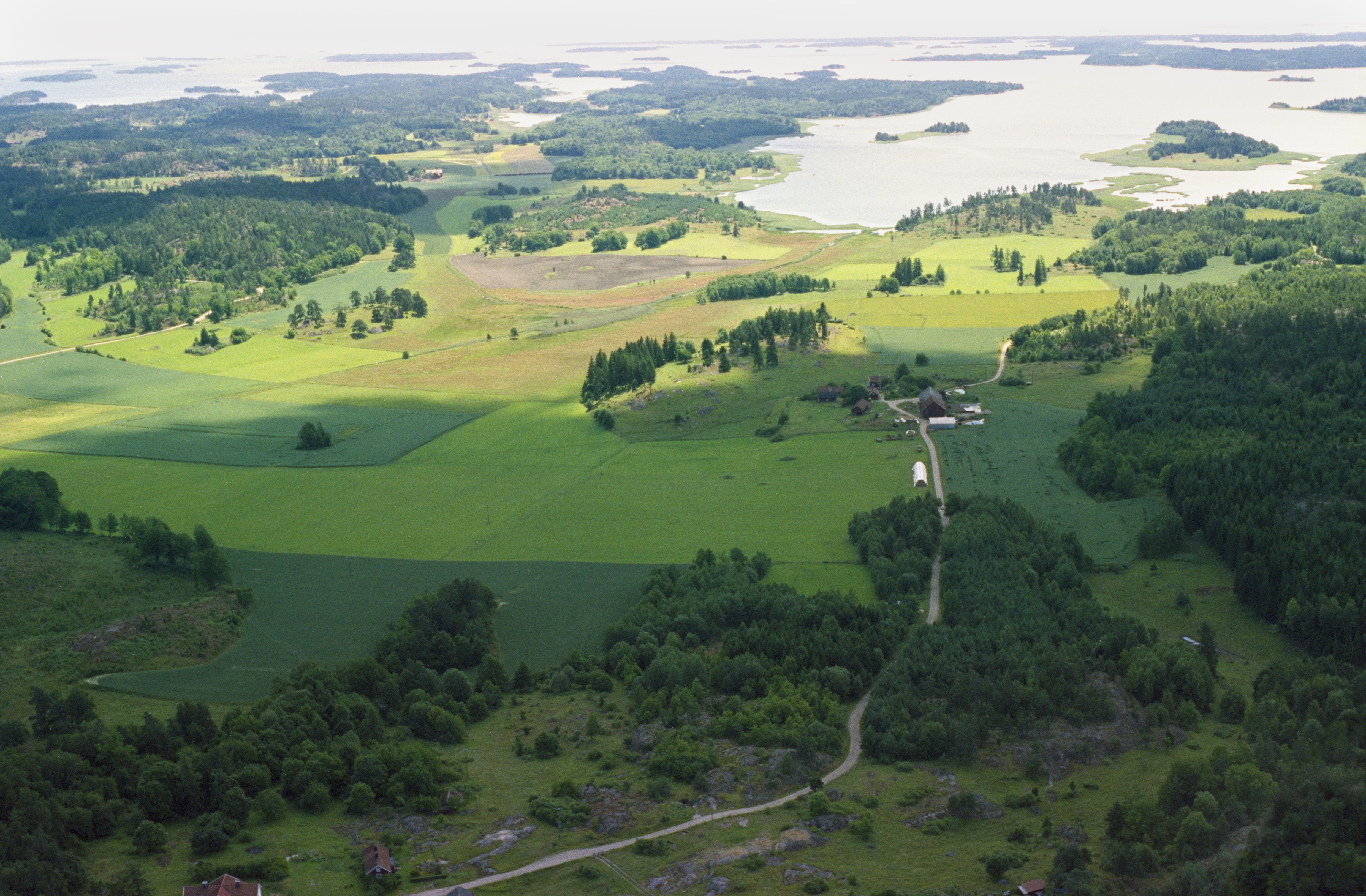 Beskrivning: Mörkö, västra delen. Kålsöfjärden i bildens övre del, Slessberget med fornborg RAÄnr RAÄnr Mörkö 24:1 uppe till vänster. Bilden är tagen mot (väderstreck): SO