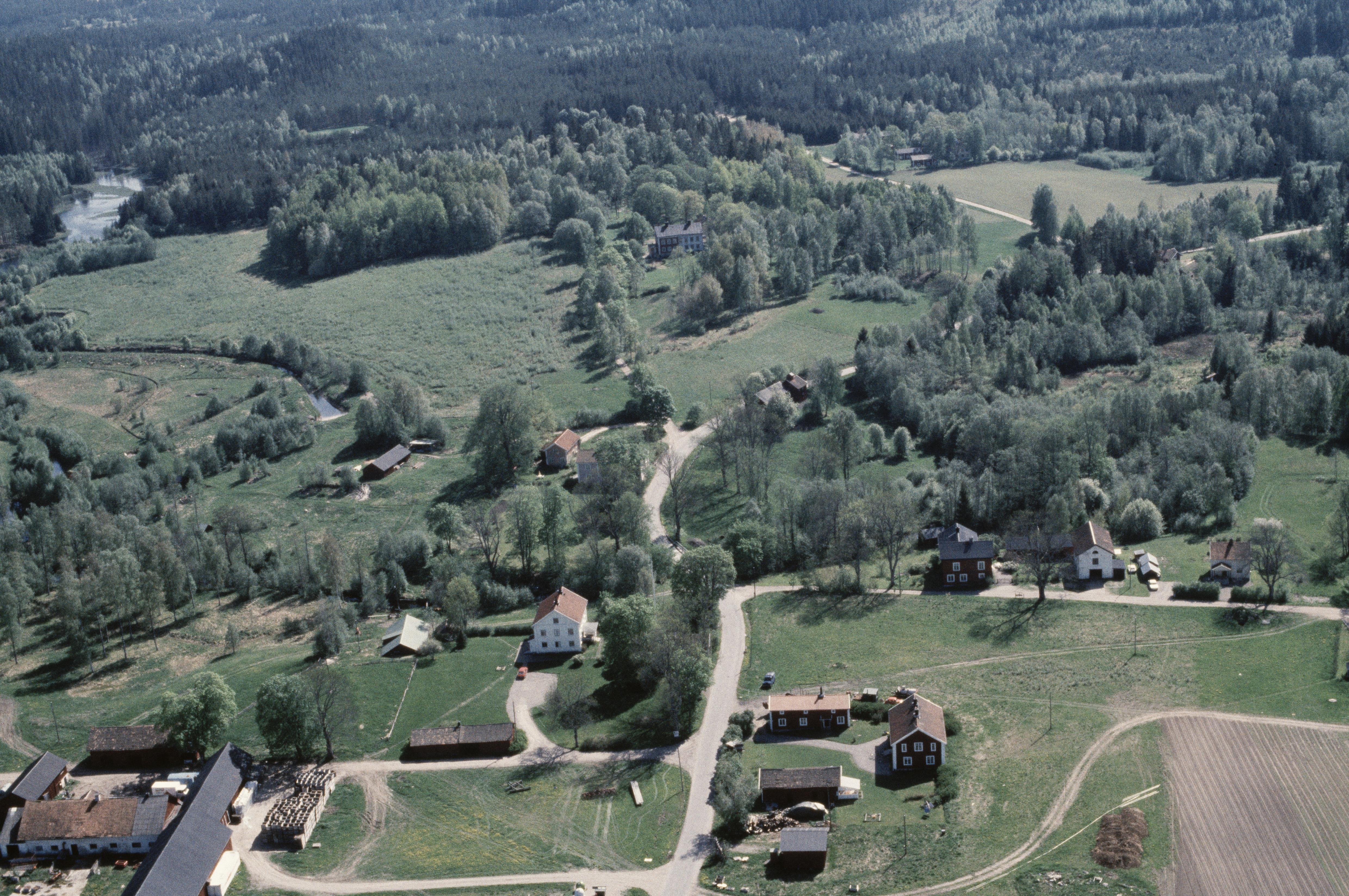 Beskrivning: Skrikarhyttans (skrivs även Skrekarhyttan) bergmansby i Mogruvälvens dalgång. Vid bildens mitt hyttområde RAÄnr Viker 11:1 vid bro Viker 82:1. Uppe till vänster gruvområde RAÄnr Viker 90:1. Bilden är tagen mot (väderstreck): S