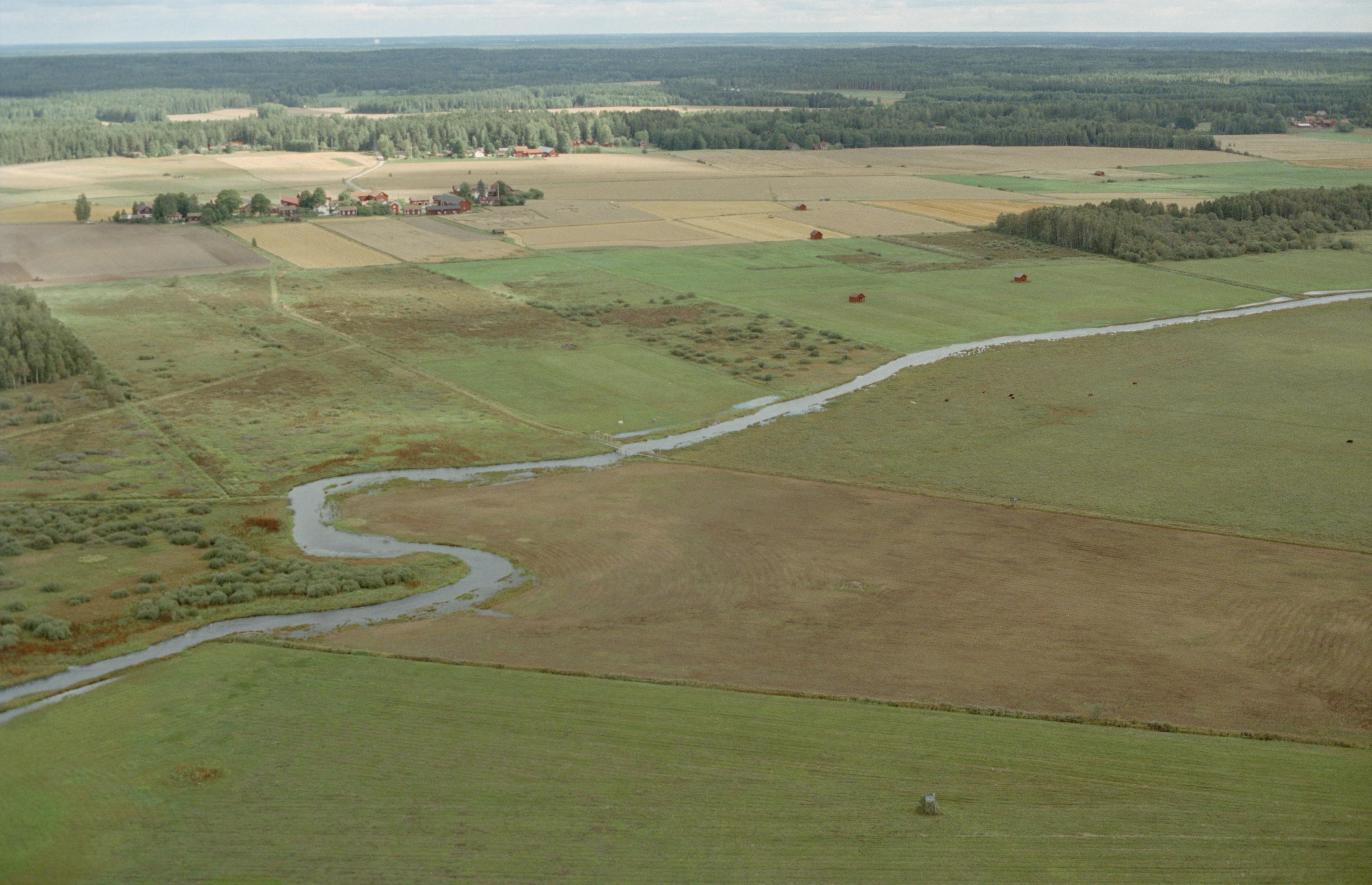 Beskrivning: Våtmarksområdet Nötmyran i Svartåns dalgång. Vid bildens mitt färdväg Smäckvägen mot bro RAÄnr Västerfärnebo 314:1-2. Hedbo by uppe till vänster. Bilden är tagen mot (väderstreck): Ö
