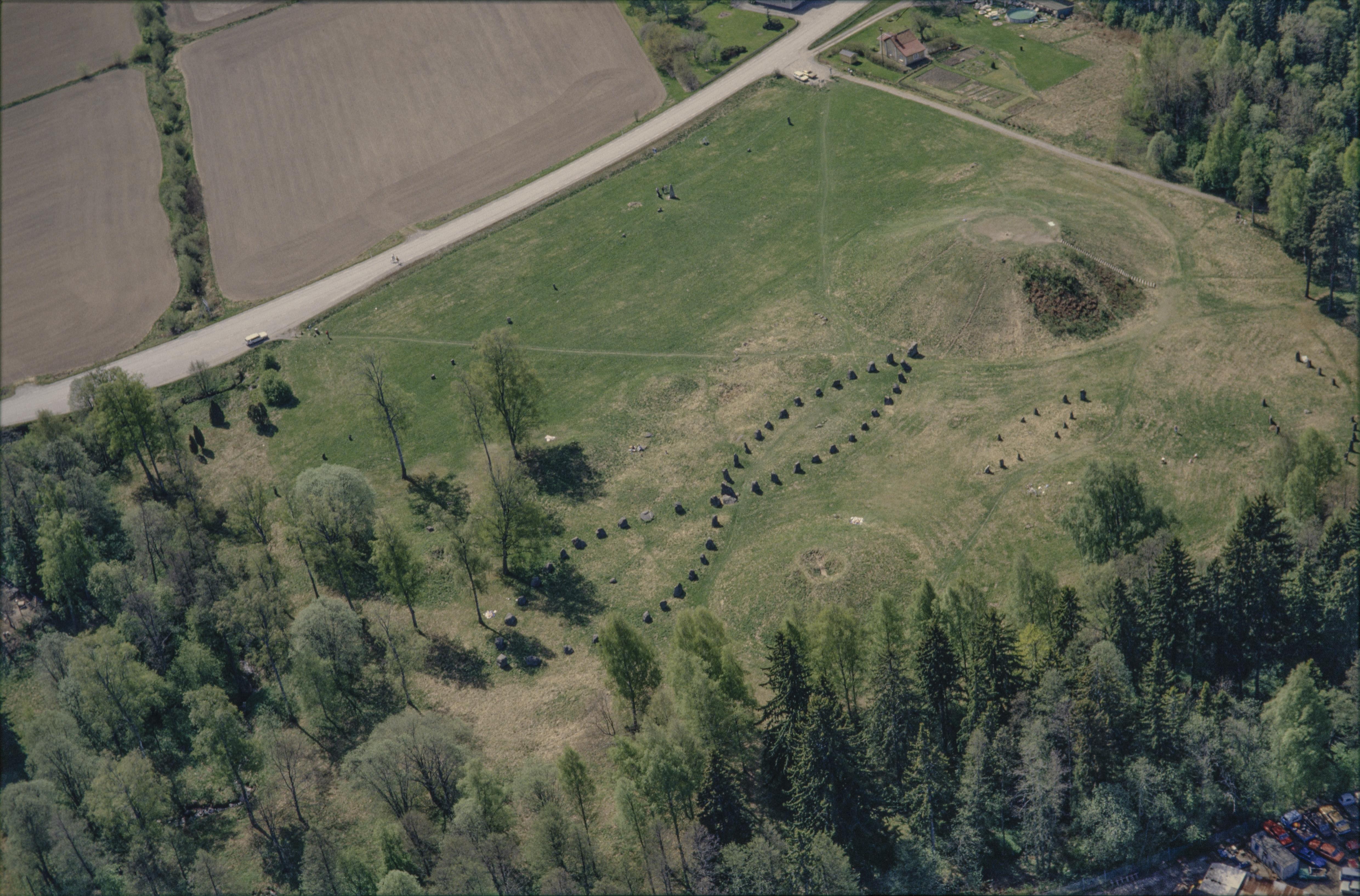 Beskrivning: Fornlämningsområdet Anundshög RAÄnr Västerås 431:1 vid Badelundaåsen i Badelunda. I området finns storhög, skeppssättningar, väglämningar och runsten m.m. Bilden är tagen mot (väderstreck): SSV