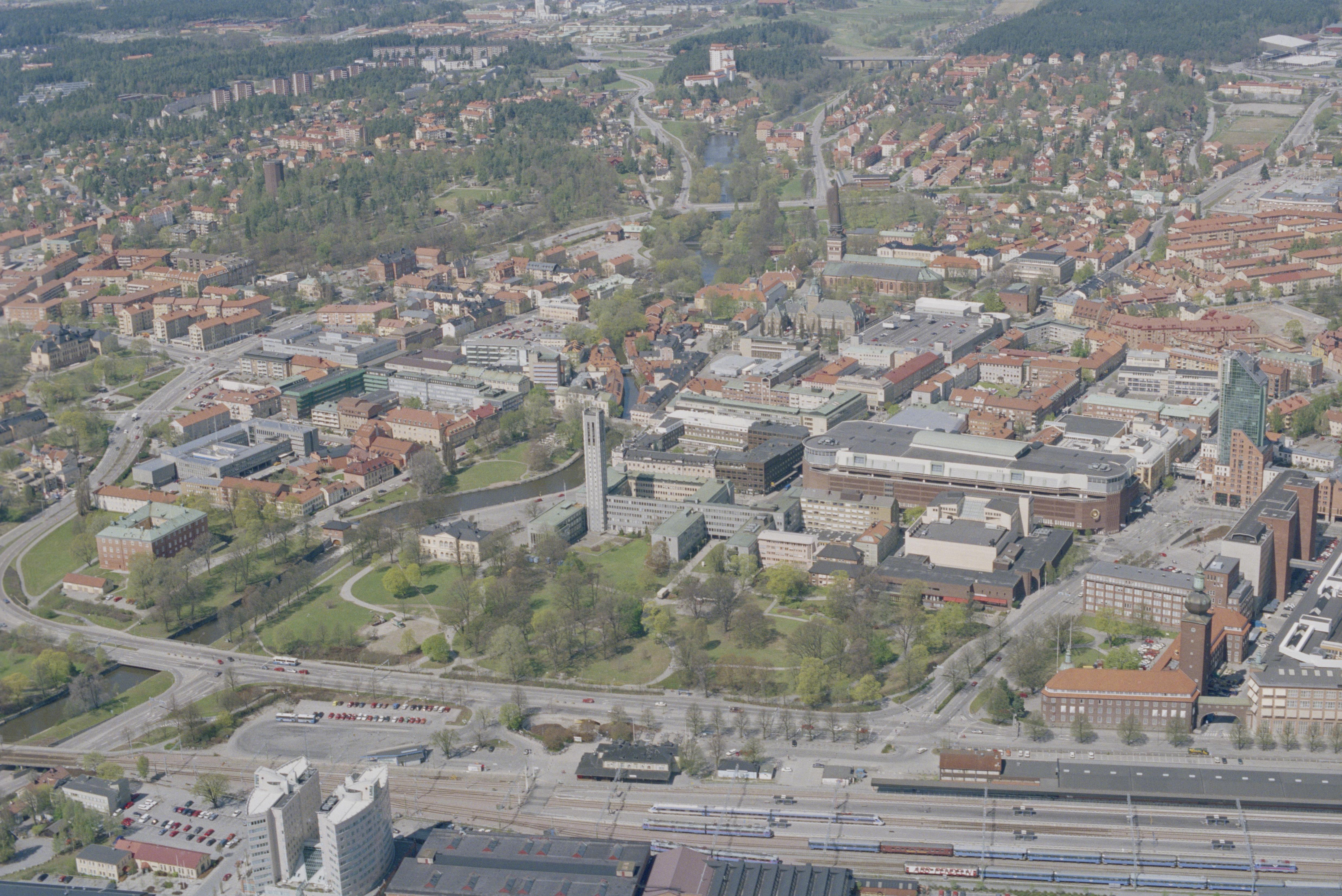Beskrivning: Västerås stad vid Svartån och Västeråsfjärden i Mälaren. Stadslager RAÄnr Västerås 232:1. Nere till vänster statliga byggnadsminnet RAÄnr Västerås 224:1 Västerås slott. Vid bildens mitt Västerås rådhus. Till höger över bildens mitt Västerås domkyrka. Bilden är tagen mot (väderstreck): NV