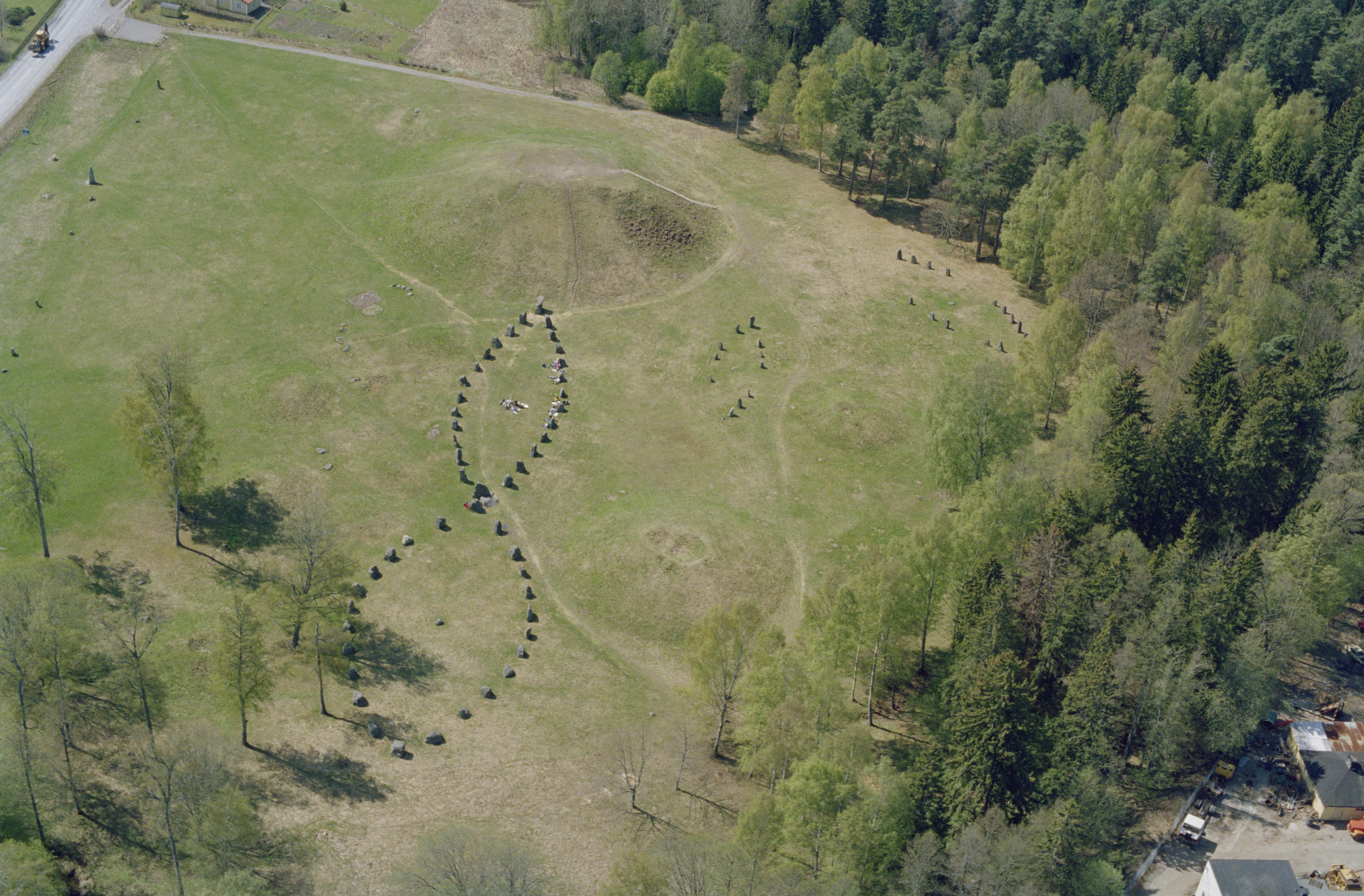 Beskrivning: Fornlämningsområdet Anundshög RAÄnr Västerås 431:1 vid Badelundaåsen i Badelunda. I området finns storhög, skeppssättningar, väglämningar och runsten m.m. Bilden är tagen mot (väderstreck): SV