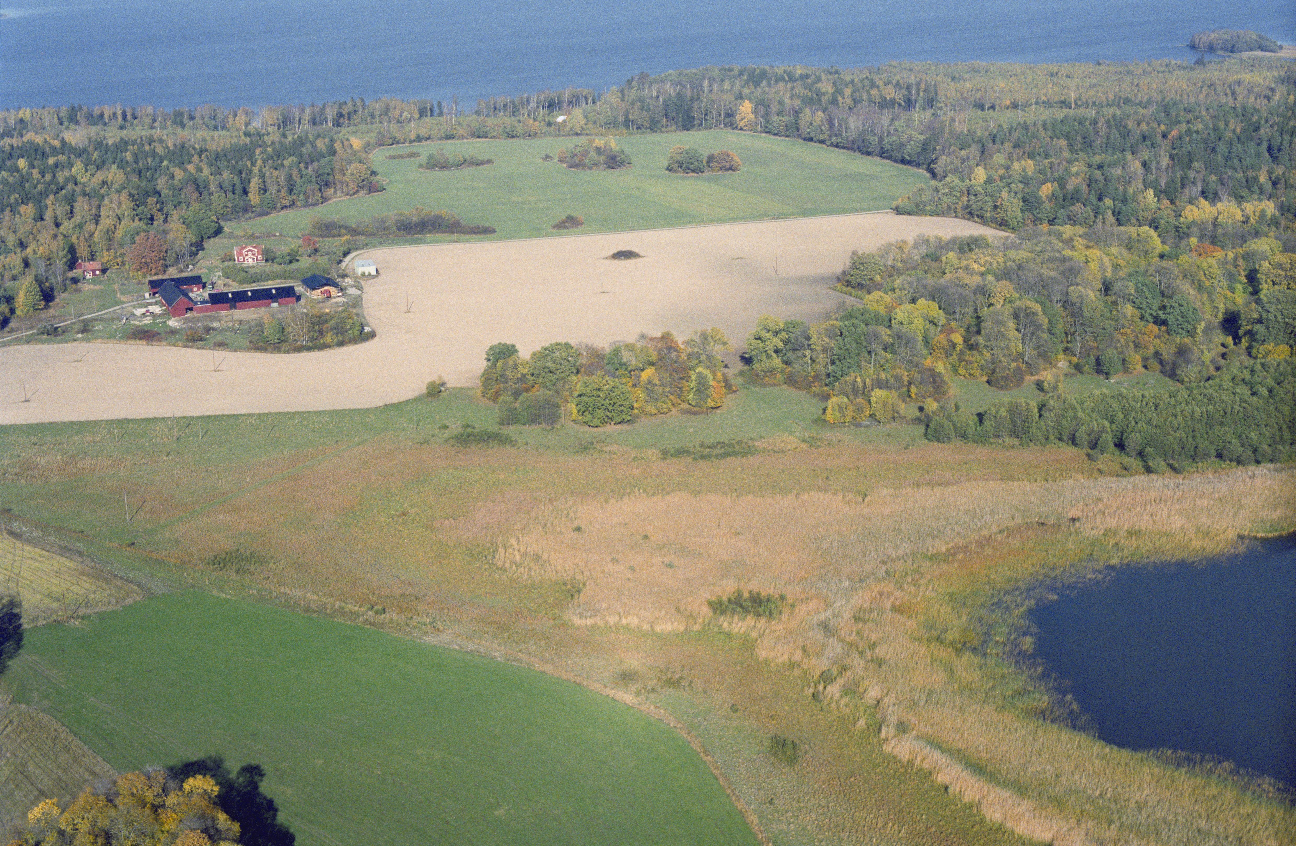 Beskrivning: Ridön i Ridöfjärden i Mälaren. Till vänster om bildens mitt Ängsnäs torp. Uppe till vänster gården Västeräng. Till höger över bildens mitt område vid Munkkällan RAÄnr Västerås-Barkarö 13:1. Bilden är tagen mot (väderstreck): NO